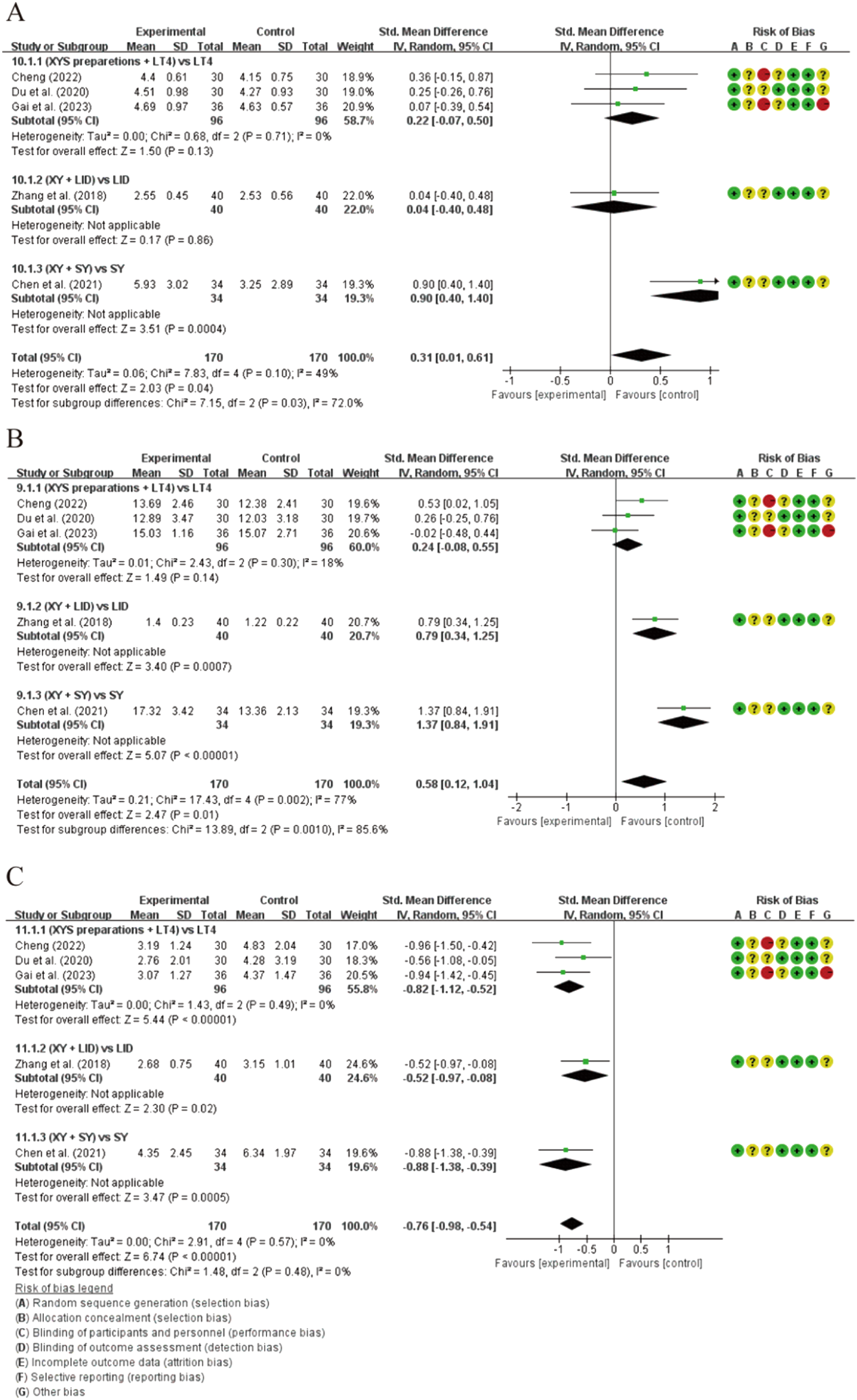 | Zhang et al. (2022) | 82/80 | 38.18 ± 10.41 | 40.28 ± 10.519 | 24/58 | 21/59 | XYSJW 30 g tid + LID | OS 1.68 g tid | 12 | no | 1,2,3,4,5,6,9 |