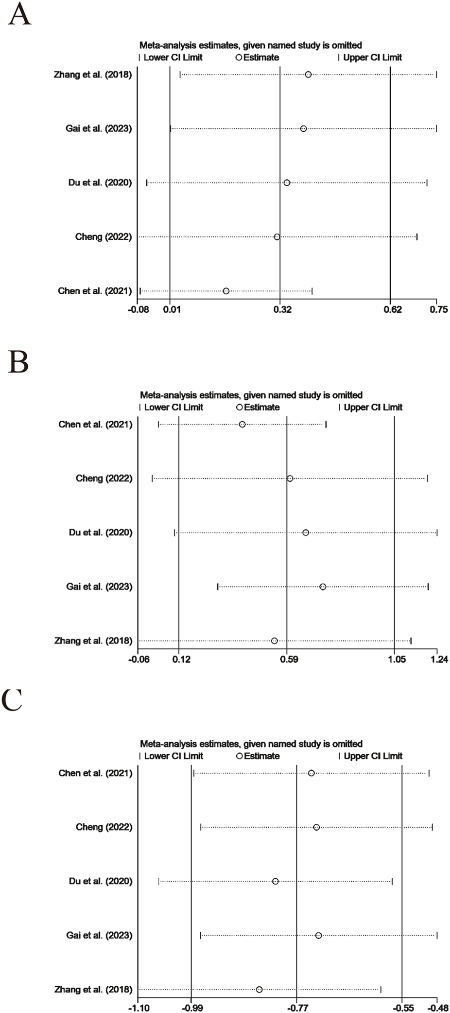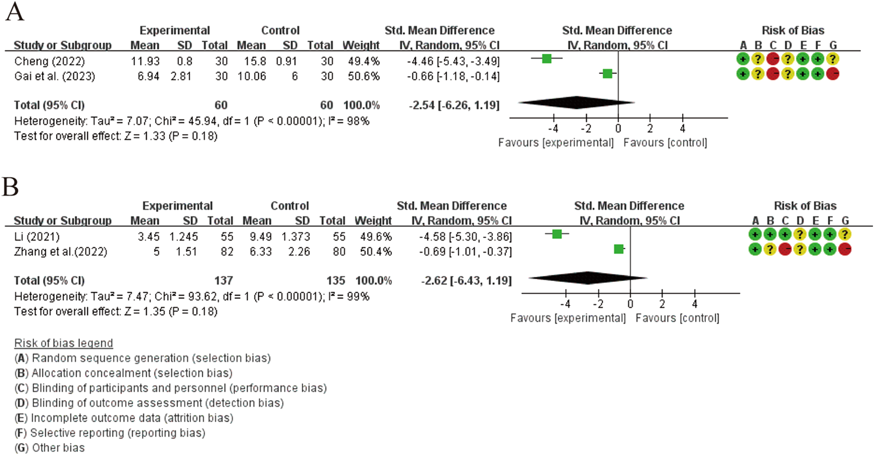 Of the seven studies analyzed, all of them employed the random number table method for group allocation (Gai et al., 2023; Du JH. et al., 2020; Zhang and Zhu, 2018; Chen et al., 2021; Cheng, 2021; Zhang et al., 2022; Li Yinan., 2021), Hence, the generation of random sequences is considered low risk. Only one study was deemed to have a low operational risk (Li YN., 2021), while the rest of the studies that did not mention blinding were considered to have a high risk of concealment bias (Cheng, 2021; Du J. et al., 2020; Zhang et al., 2022). Three studies that only described physiological indicators were considered to have an unclear operational risk, while the detection bias was considered low (Cheng, 2021; Gai et al., 2023; Zhang and Zhu, 2018). The detection bias was unclear in the remaining studies. All study data has been finalized, and the attrition rate is below 10%. The absence of pre-registration for the study protocols introduces an ambiguous risk of first-reporting bias for all examined investigations. Consequently, it is unfeasible to ascertain if all anticipated effects have been documented. In two investigations, the gender distribution of male and female patients diverged from the actual clinical demographics (Gai et al., 2023; Zhang et al., 2022), indicating the potential presence of additional biases. Figure 2 depicts the evaluation of probable bias in the reviewed literature.