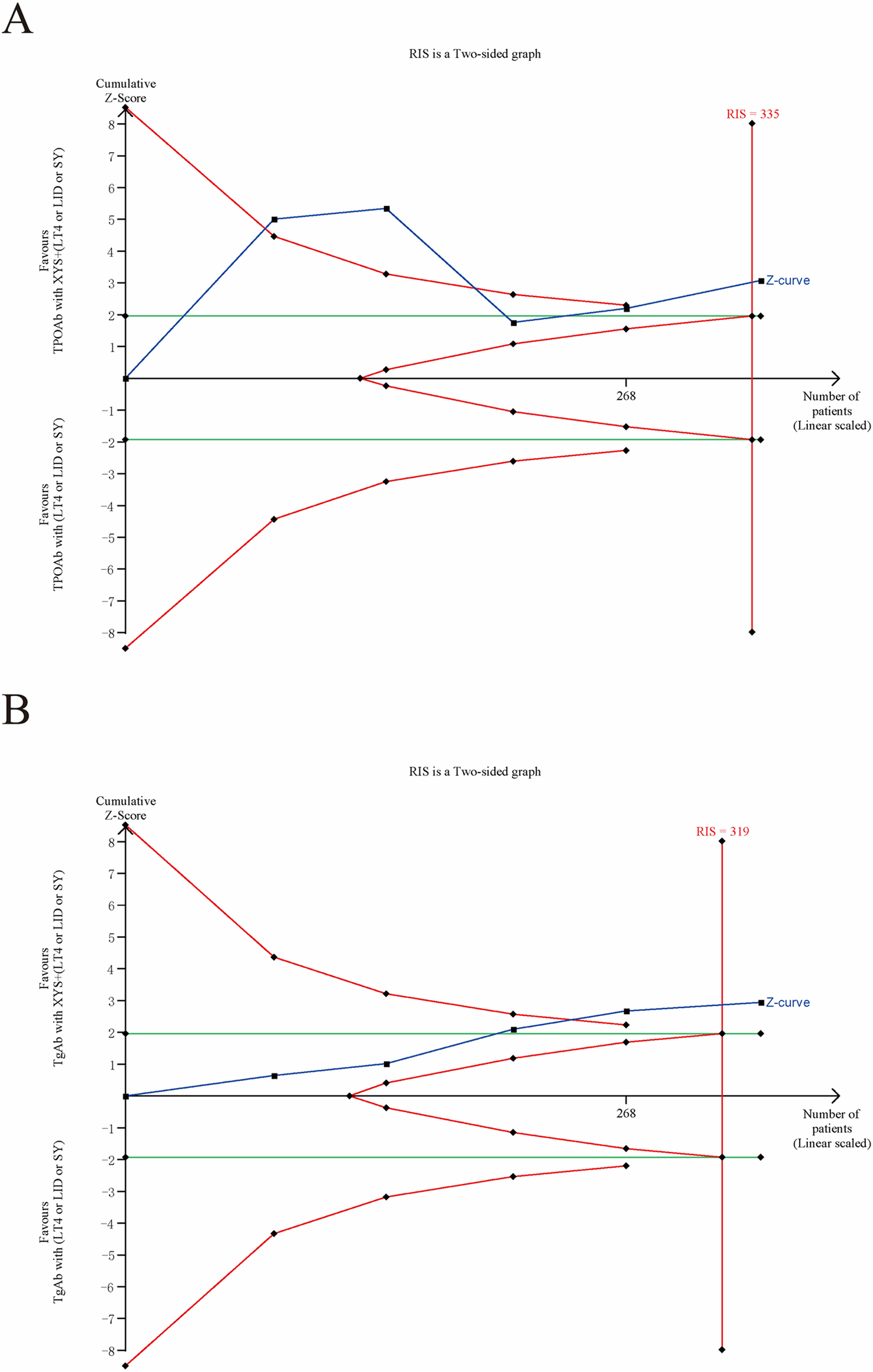 This study analyzed seven randomized controlled trials involving 612 patients. Meta-analysis demonstrated that XYS preparations significantly reduced TPOAb levels [SMD = −0.74, 95% CI (−1.02, −0.46), p < 0.00001]. Combining LT4 with XYS preparations resulted in greater TPOAb reduction compared to LT4 alone [SMD = −0.77, 95% CI (−1.06, −0.47), p < 0.00001] and was more effective in lowering TgAb levels [SMD = −0.66, 95% CI (−1.05, −0.26), p = 0.001]. XYSJW outperformed OS in reducing TgAb [SMD = −0.35, 95% CI (−0.58, −0.10), p = 0.005]. Four XYS preparations (XY, HHXY, GQXY, and DZXY) increased FT3 and FT4 levels [SMD = 0.13, 95% CI (0.01, 0.61), p = 0.04; SMD = 0.58, 95% CI (0.12, 1.04), p = 0.01] and decreased TSH [SMD = −0.76, 95% CI (−0.98, −0.54), p < 0.00001]. Subgroup analysis indicated XY significantly improved FT3 and FT4 levels, but XYS preparations combined with LT4 did not enhance FT3/FT4 restoration. XYSJW also did not reduce TSH more effectively than OS. Evidence quality was low or very low. TSA confirmed the pooled effect estimates, with cumulative z-curves for TPOAb, TgAb, and TSH surpassing the benefit threshold.