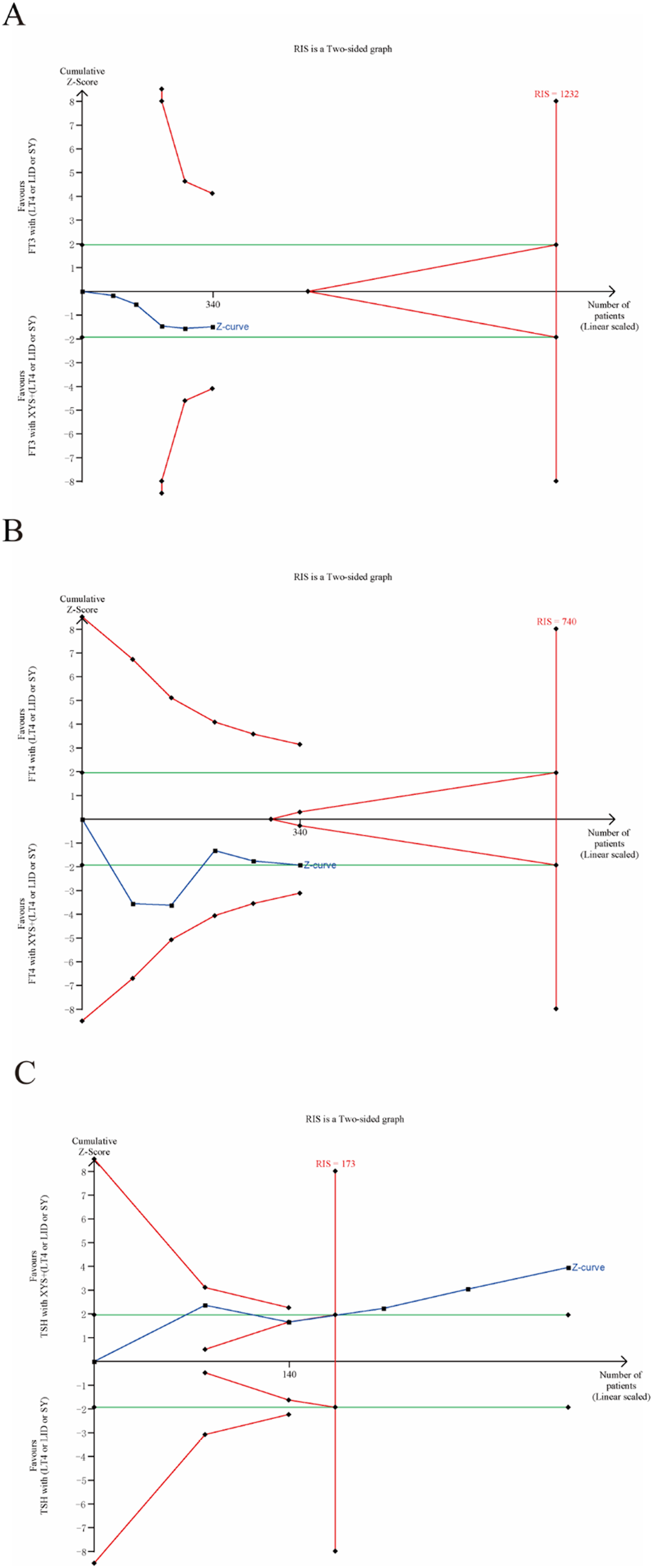 The Cochrane Q test was employed to examine the heterogeneity among the findings of the studies that were included, while I2 was utilized to measure the extent of heterogeneity (Higgins and Thompson, 2002). When the value of p ≥ 0.1 and the value of I2 < 50%, there was no statistically significant variation in each outcome. Therefore, the fixed effect model was employed for Meta-analysis. When the p < 0.1 and the I2 > 50%, the results exhibit statistical heterogeneity, and the cause of this heterogeneity was further investigated. Only methods such as subgroup analysis or descriptive analysis were employed to identify the causes of considerable clinical heterogeneity. Following the clarification of the impact of substantial clinical heterogeneity, a random-effects model was employed for the meta-analysis. A meta-analysis was conducted using a significance threshold α = 0.05. The robustness of the pooled results was assessed using TSA and sensitivity analysis (leave-one-out approach). The objective of this study was to investigate XYS preparations with different treatment regimens (including combinations with LT4, SY, etc.) and formulation compositions (such as variations in the original formula, additives, and subtractions). The Egger’s test was used to evaluate the presence of publication bias in the meta-analysis when there were 10 or more papers included. If the value of p < 0.05, it suggests that the study exhibited publication bias. Sensitivity analyses and Egger’s test were conducted using Stata software (version 18, Stata Corporation, College Station, Texas, United States). Finally, for results that cannot be enhanced by the above methods, the Rosenthal fail-safe N is employed to measure the number of non-significant studies that need to be published to invalidate the meta-analysis findings (Becker, 2005), thereby increasing the certainty of the results. The calculation of Rosenthal fail-safe N is conducted using R software (version 4.3.0; R Core Team, 2023).