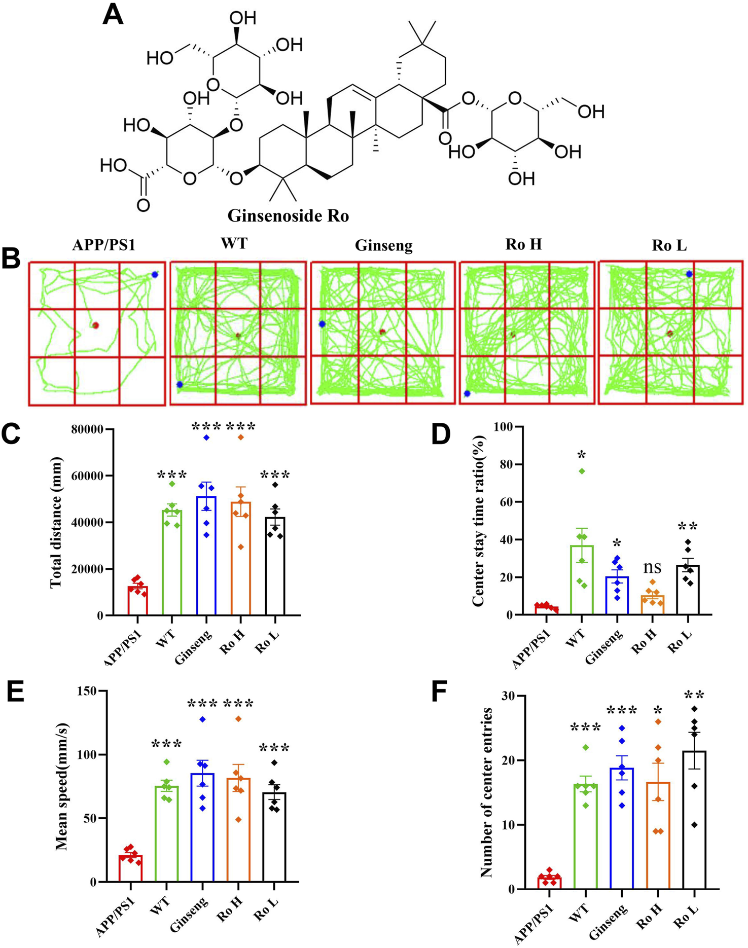 Ginsenoside Ro improve spatial exploration ability and anxiety state in APP/PS1 mice. (A) Chemical structural formula of Ginsenoside Ro. (B) Diagram of open field trajectory. (C) Total distance traveled for locomotion. (D) Central residence time. (E) Mean speed. (F) Number of center entries. Data are expressed as MEAN ± SEM. Statistical significance is indicated as *P < 0.05, **P < 0.01, ***P < 0.001 (n = 6).