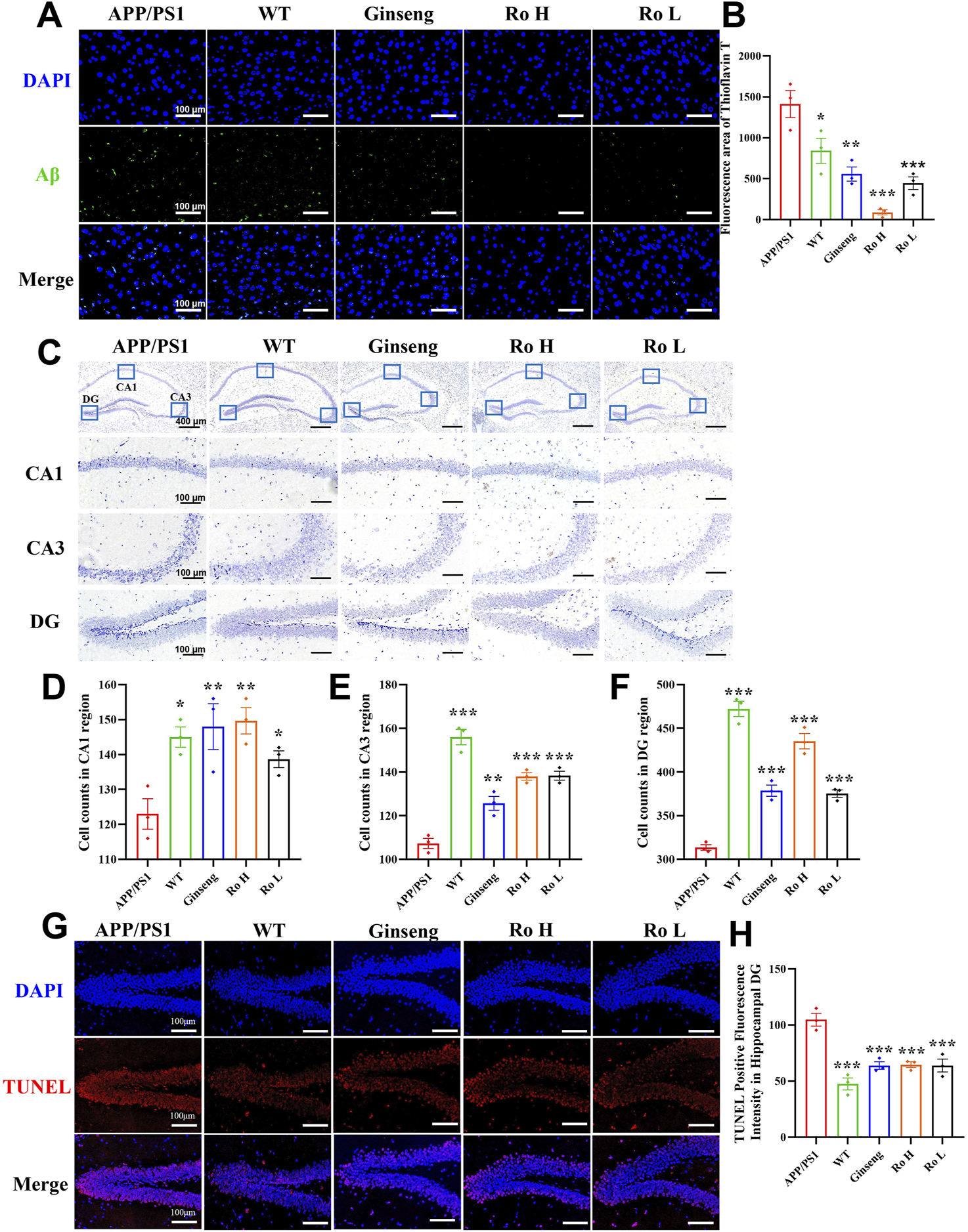 Ginsenoside Ro reduce Aβ deposition and ameliorate neuronal apoptosis in the cerebral cortex of APP/PS1 mice. (A) Representative image of thioflavin-T staining fluorescence. (B) Histogram of thioflavin-T fluorescence statistics. (C) Representative image of Nissl staining in the mouse hippocampal area. (D) Histogram of cell counts in the CA1 region. (E) Histogram of cell counts in the CA3 region. (F) Histogram of cell counts in the DG region. (G) Representative graph of fluorescence of TUNEL staining. (H) Histogram of fluorescence statistics of TUNEL staining.Data are expressed as MEAN ± SEM. Statistical significance is indicated as *P < 0.05, **P < 0.01, ***P < 0.001 (n = 3).