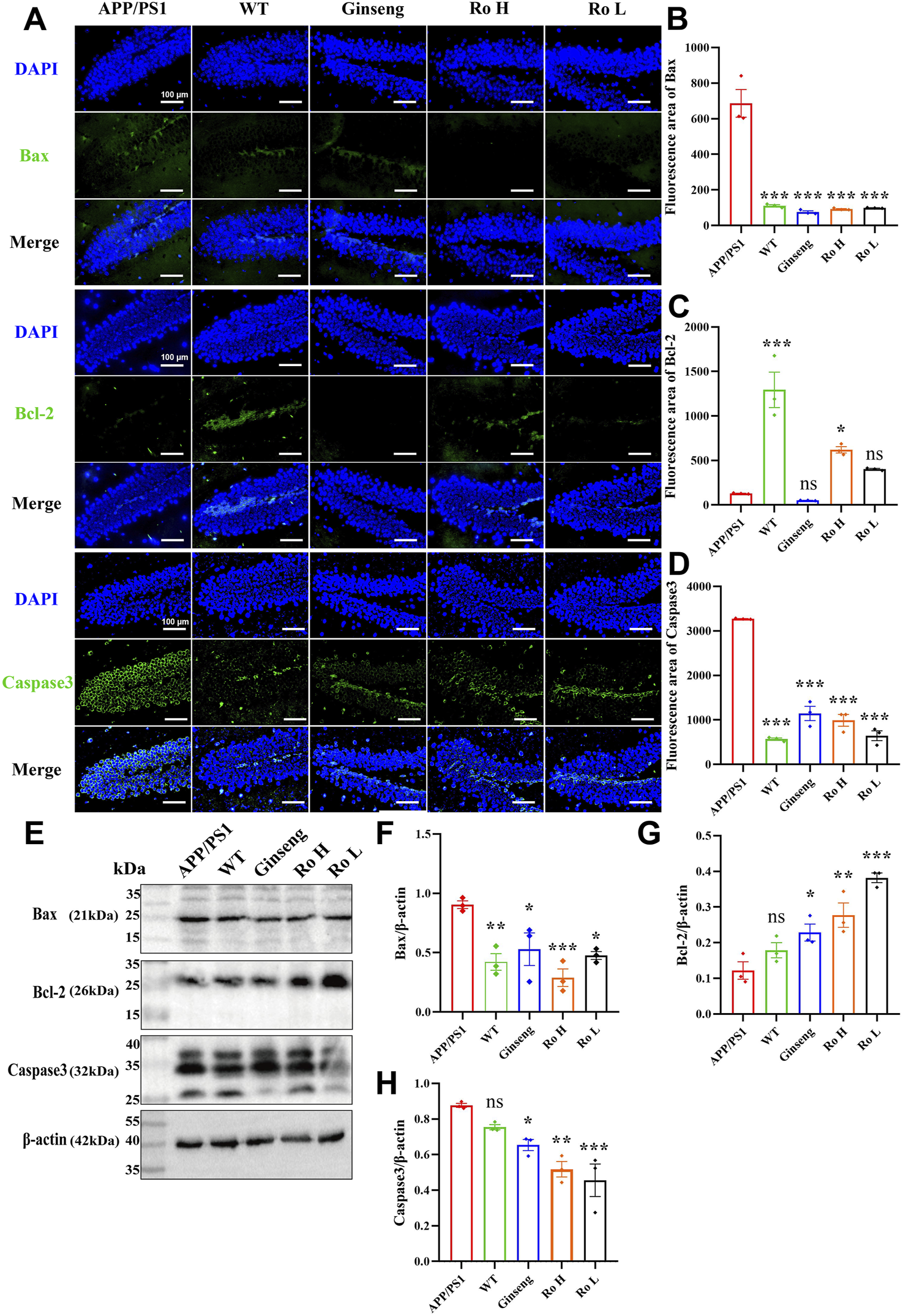 The effect of Ginsenoside Ro on neuronal apoptosis in APP/PS1 mice was analyzed through immunofluorescence staining and Western blotting for Bax, Bcl-2, and Caspase3 proteins (Figure 7). Representative images of immunofluorescence staining (Figure 7A) show that the fluorescence intensity of pro-apoptotic proteins Bax and Caspase3 was higher in APP/PS1 mice compared to WT and drug-treated groups, while the fluorescence intensity of the anti-apoptotic protein Bcl-2 was higher in the WT and Ro high-dose (Ro H) groups. Histograms of immunofluorescence intensity for Bax (Figure 7B, P < 0.001), Bcl-2 (Figure 7C, P < 0.05), and Caspase3 (Figure 7D, P < 0.001) corroborate these observations, indicating significant reductions in Bax and Caspase3 and an increase in Bcl-2 in the drug-treated groups.