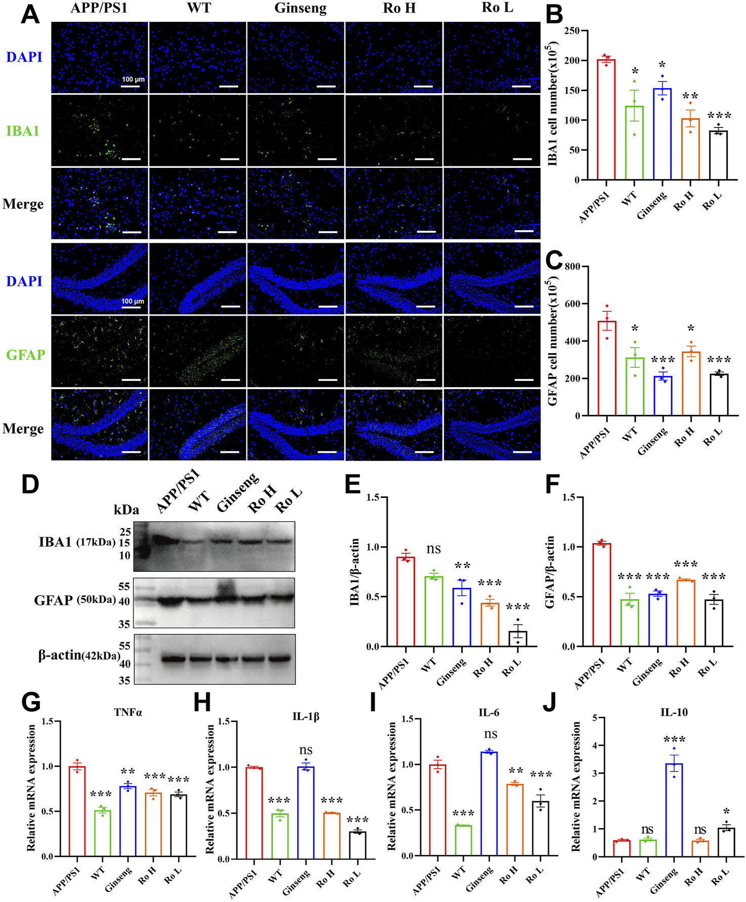 To further investigate the anti-inflammatory effects of our treatments, we assessed the expression levels of inflammatory cytokines TNF-α, IL-1β, and IL-6 using ELISA (Supplementary Figure S2). WT mice exhibited significantly lower levels of all three inflammatory markers compared to APP/PS1 mice (P < 0.001). Ginseng treatment significantly reduced the expression of TNF-α (Supplementary Figure S2A, P < 0.05), IL-1β (Supplementary Figure S2B, P < 0.01), and IL-6 (Supplementary Figure S2C, P < 0.001). Similarly, RO H treatment decreased the levels of TNF-α (Supplementary Figure S2A, P < 0.05), IL-1β (Supplementary Figure S2B, P < 0.01), and IL-6 (Supplementary Figure S2C, P < 0.01). RO L treatment also resulted in reduced expression of IL-1β (Supplementary Figure S2B, P < 0.05) and IL-6 (Supplementary Figure S2C, P < 0.05).