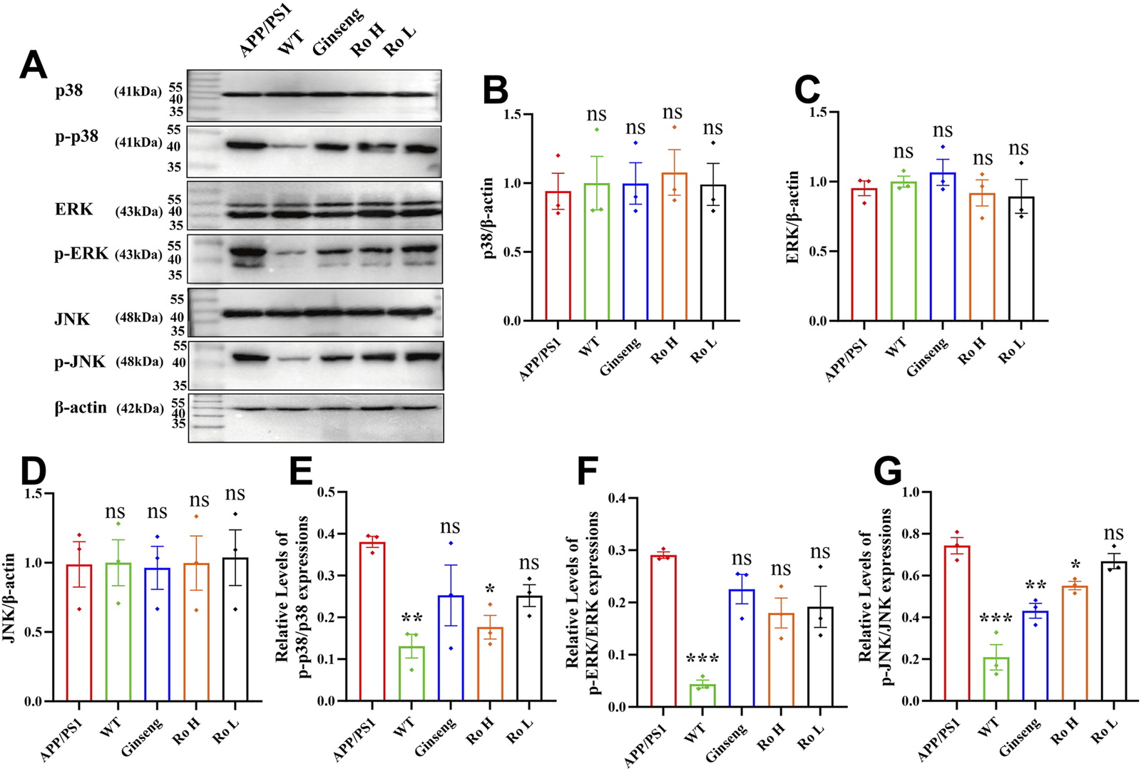 Mechanism of the effect of Ginsenoside Ro on the MAPK pathway in APP/PS1 mice. (A) Representative images of Western blot for p-p38, p-ERK, and p-JNK. (B) Histogram of Western blot statistics for p38. (C) Histogram of Western blot statistics for ERK. (D) Histogram of Western blot statistics for JNK. (E) Histogram of Western blot statistics for p-p38/p38. (F) Histogram of Western blot statistics for p-ERK/ERK. (G) Histogram of Western blot statistics for p-JNK/JNK. Data are expressed as MEAN ± SEM, and statistical significance is expressed as *P < 0.05, **P < 0.01, ***P < 0.001 (n = 3)