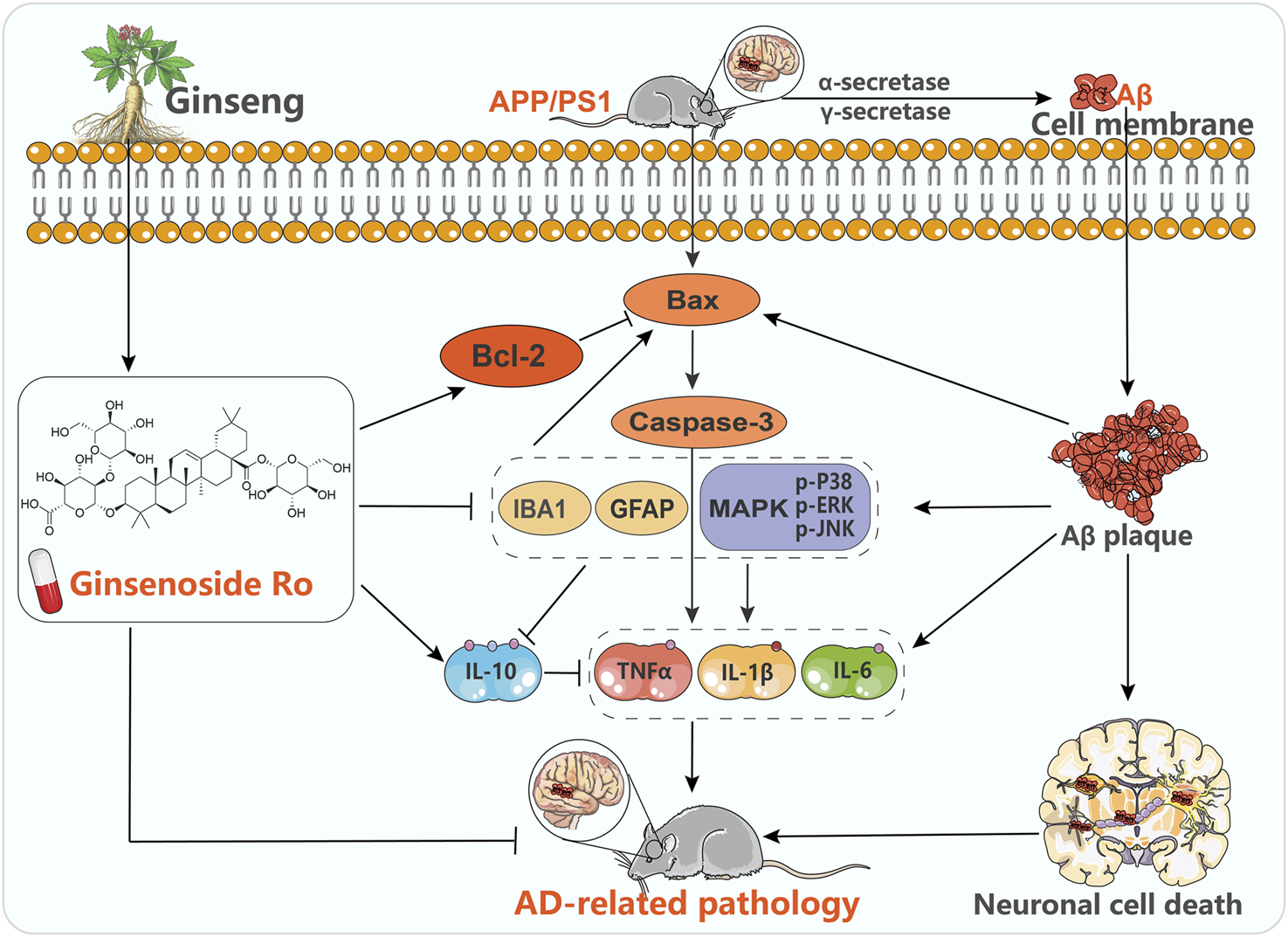 Li T, Chen J, Xie Z, Fang J, Wu Q, Cao X, Chen Z, Wang Y, Fan Q, Wang Q and Liu J (2025) Ginsenoside Ro ameliorates cognitive impairment and neuroinflammation in APP/PS1 mice via the IBA1/GFAP-MAPK signaling pathway. Front. Pharmacol. 16:1528590. doi: 10.3389/fphar.2025.1528590