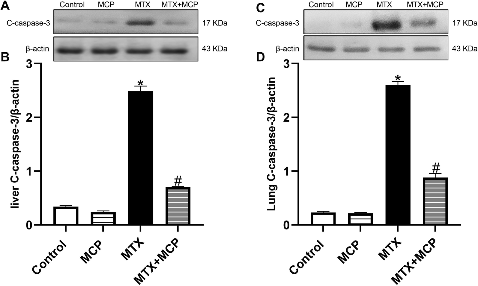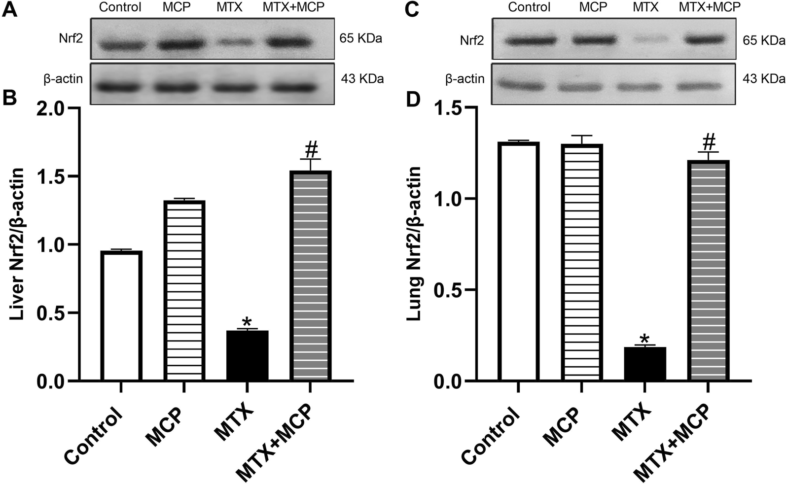 Compared to the control group, MTX significantly (P < 0.05) diminished Nrf2 protein expression in liver and lung tissues, while co-treatment with MCP significantly (P < 0.05) prevented this decrease induced by MTX, as shown in Figure 4.