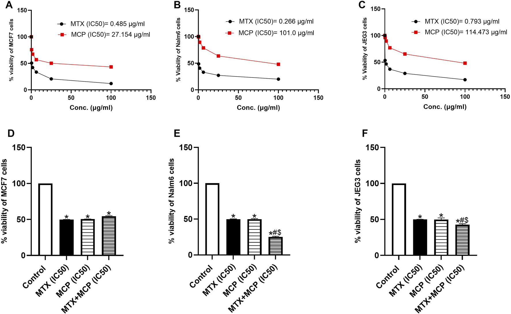 An in vitro toxicological assay kit (Sigma Aldrich, Inc., M-5655) which is MTT-based was utilized to assess MTX, MCP, and their combination cytotoxicity on MCF7, Nalm6, and JEG3 cell lines. The cancer cells were seeded into a 96-well plate containing 100 μL of the culture media at 1 × 104 cells/mL density and incubated for 1 day. Afterwards, the culture media was exchanged with 100 μL of a new media with different concentrations of the tested drugs; MTX and MCP (0.4, 1.6, 6.3, 25, 100 μg/mL) and vehicle control, 0.01% dimethyl sulfoxide (DMSO), for 48 h. Each well of the plates was incubated for another 4 hours with 20 μL of MTT in 200 μL of media. Eliza microplate reader (BDR206, Bioline Technology, India) was used for optical density determination, with a 570 nm absorbance. Each concentration of each drug was done in triplicate wells for assessment of IC50 (the concentration required to inhibit 50% of cell growth) of MTX and MCP. After the assessment of the IC50 of each drug for each cell line, another experiment was carried out. The IC50 of MTX was added in combination with that of MCP to the three types of cancer cells for measuring the percentage of cell viability of each cell line to study the effect of MCP on MTX cytotoxicity.