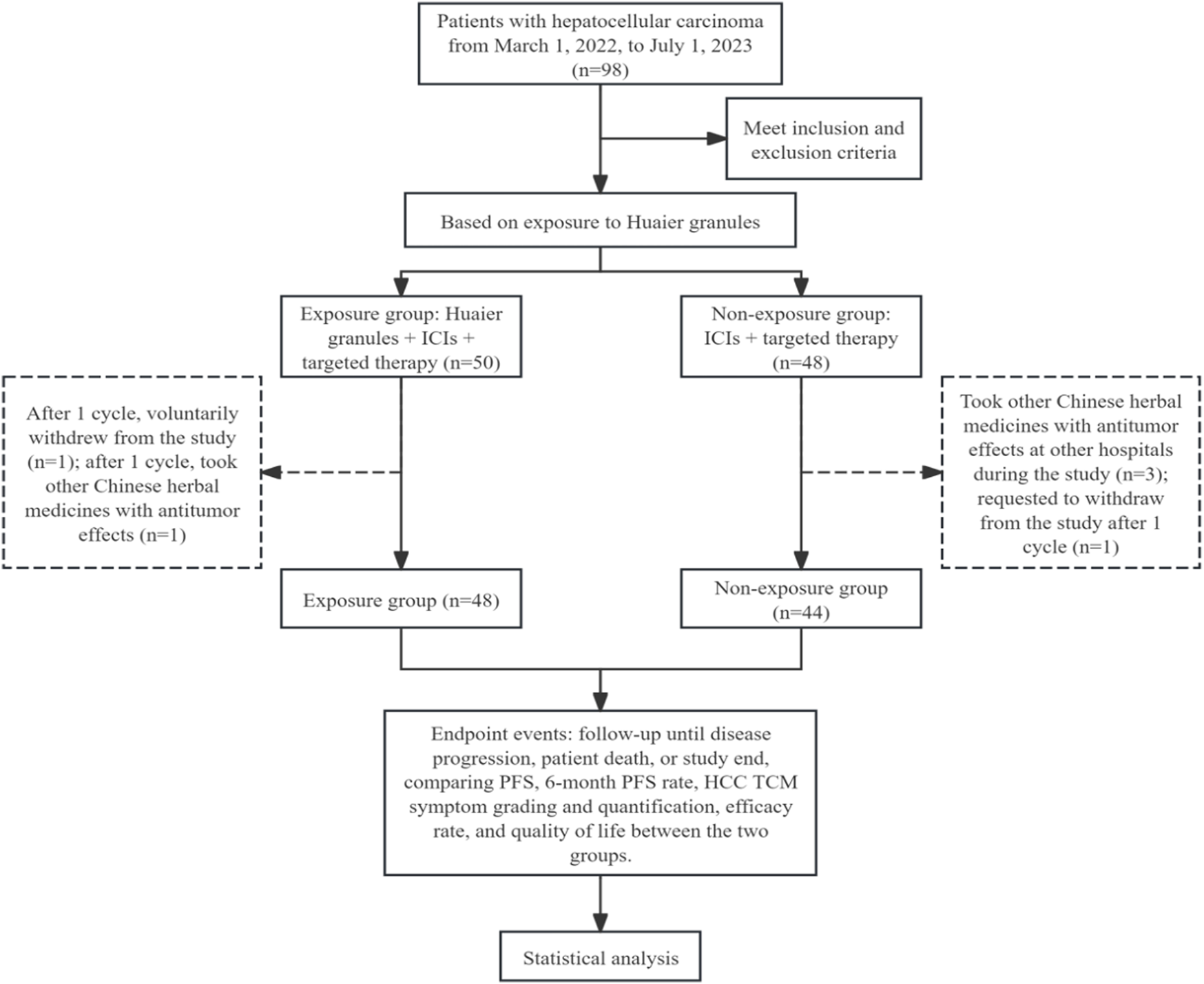 The use of Huaier granules during treatment was considered as the exposure factor, dividing the patients into two groups: those receiving Huaier granules (exposure group) and those who did not (non-exposure group). For the exposure group: Initiation of HuaiEr Granules oral administration concurrently with ICIs and targeted therapy treatments, 20 g per granule, produced and supplied by Qidong Gaitianli Pharmaceutical Co., Ltd., at a dosage of 20 g per administration, three times daily. Exposure to Huaier granules must be maintained for at least 15 days, and targeted therapy must include a minimum of two treatment cycles. For the non-exposure group, the dosage of ICIs and targeted drugs is to be determined by the attending clinician. No other systemic anti-tumor treatments are allowed for the target lesions, but localized palliative radiotherapy for isolated lesions (non-liver lesions) and treatment for bone metastases are permitted to control symptoms.