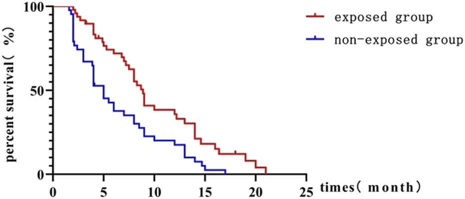 The exposure group had a significantly longer mPFS of 8.9 months compared to 5 months in the non-exposure group (HR = 0.50; 95% CI, 0.317–0.783; P = 0.001) as shown in Figure 2. The 6-month PFS rate was significantly higher in the exposure group compared to the non-exposure group, at 66.7% versus 34.1%, respectively, with a statistically significant difference (P = 0.001).