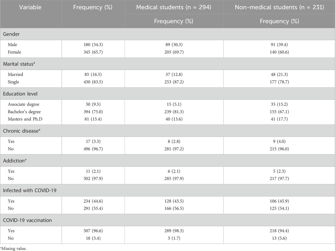 The samples included 294 medical and 231 non-medical students with a mean age of 21.84 ± 3.17 and 23.97 ± 6.11 years, respectively. In both groups of students, females outnumbered males, but the proportion of females was higher among medical students (n = 205; 69.7%). The majority of participants were single, although the proportion of married individuals was greater among non-medical students (n = 48; 21.3%). In both groups of students, the majority were at the undergraduate level. The prevalence of chronic diseases and addiction was low in both groups, and there was no significant difference between the two groups (Table 1).