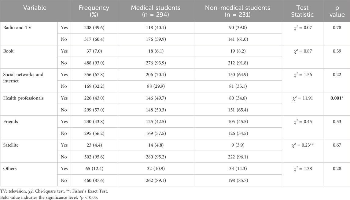 In the present study, the internet and social networks were the primary sources of information about CAM for both medical and non-medical students. Similarly, Yurtseven et al. found that the internet (52.2%) and television (27.2%) were the main sources of CAM information (Yurtseven et al., 2015). Iktidar et al. reported that medical and non-medical students in Bangladesh relied on friends, personal experience, and newspapers as their primary sources of CAM information (Iktidar et al., 2022). Ashraf et al. identified family, friends, and mass media as the most common sources of CAM information among pharmacy and non-pharmacy students (Ashraf et al., 2019). Given the widespread accessibility of the internet and the vast amount of content available online (Jafari et al., 2021), it is reasonable to expect the internet to be a primary source of information. However, we found a significant difference between medical and non-medical students in terms of utilizing healthcare professionals as a source of information. To date, no other studies have identified healthcare professionals as a significant source of CAM information.
