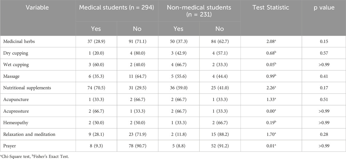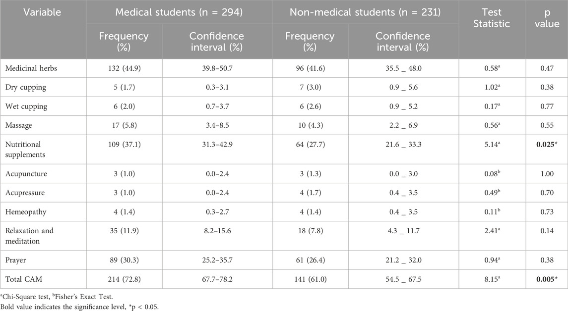 In our study, 72.8% of medical students and 61.0% of non-medical students reported using at least one method of CAM, including medicinal plants, nutritional supplements, and prayer. Similarly, Alshahrani’s study in Saudi Arabia found that herbal medicine was the most commonly used CAM method among medical students (21%), while spiritual healing/Quran recitation was the most prevalent among non-medical students (19%) (Alshahrani, 2024). Ashraf et al. identified medicinal herbs, massage, spiritual healing, yoga, and homeopathy as the most common CAM methods among pharmacy and non-pharmacy students (Ashraf et al., 2019). Additionally, Iktidar et al. reported that homeopathy was the most widely known CAM method among medical students (44.6%), while herbal medicine was the most popular among non-medical students (45.7%) (Iktidar et al., 2022). Other studies have also highlighted medicinal plants and food supplements as the most frequently used CAM methods among medical students and healthcare personnel (Ameade et al., 2016; Bulatova et al., 2022; Samara et al., 2019). However, the preferred CAM methods vary across countries. For example, magnetic therapy and spiritual healing are the most well-known CAM methods in Saudi Arabia, medicinal plants are the most popular in Turkey (Bishop, Yardley and Lewith, 2006) and herbal medicines were more popular in Kuwait (Ilori, Akintayo, Adewale and Oyetola, 2021). These differences can be attributed to variations in cultural and belief systems (Iktidar et al., 2022; Yurtseven et al., 2015).