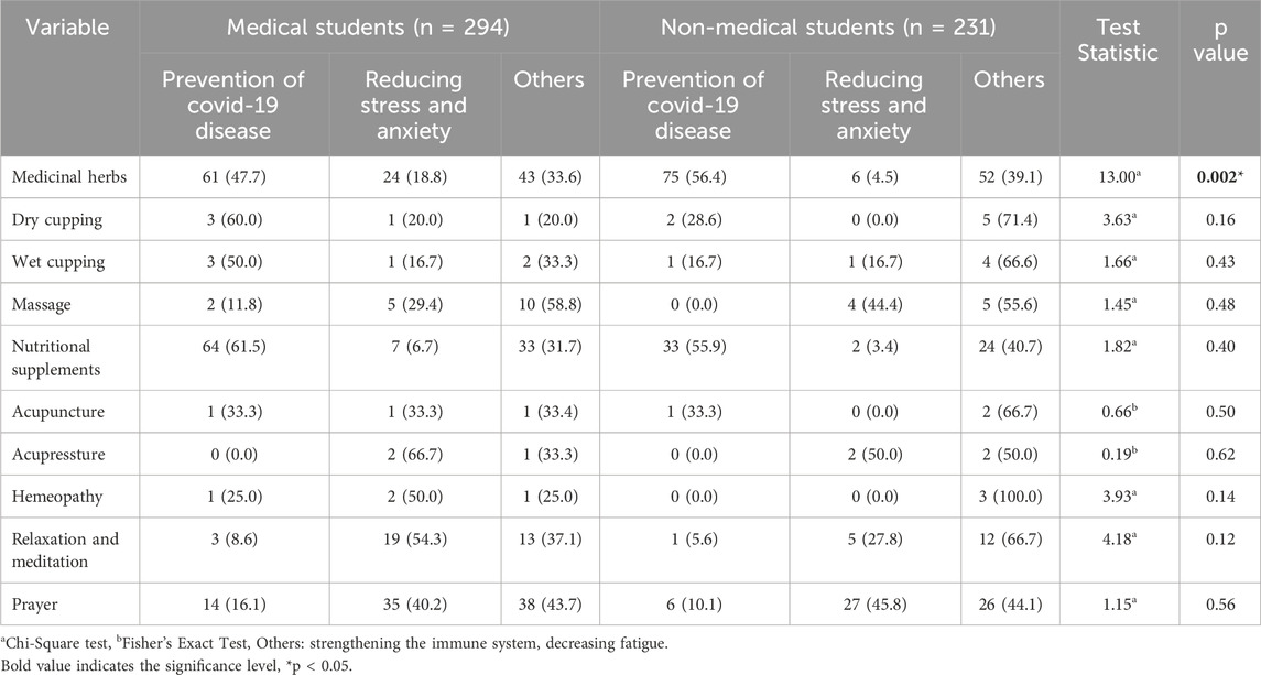 Nutritional supplements were used by the medical students (n = 64) to prevent COVID-19 disease whereas medicinal herbs were utilized by the non-medical students with the same purpose (n = 75). On the other hand, prayer was the most used method of CAM by the medical (n = 35) and non-medical (n = 27) students to reduce stress and anxiety.