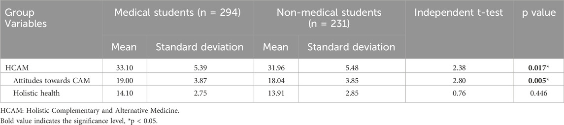 The mean HCAMQ scores obtained by the medical and non-medical students were 33.10 ± 5.39 and 31.96 ± 5.48, respectively. The mean HCAMQ score of the medical students was statistically significantly higher than non-medical students (p = 0.017). Besides, there was a statistically significant difference between the scores obtained from the attitudes towards CAM subscale (p = 0.005). On the other hand, there was no significant difference between the scores obtained by the two groups from the holistic health subscale of the HCAMQ (Table 6).