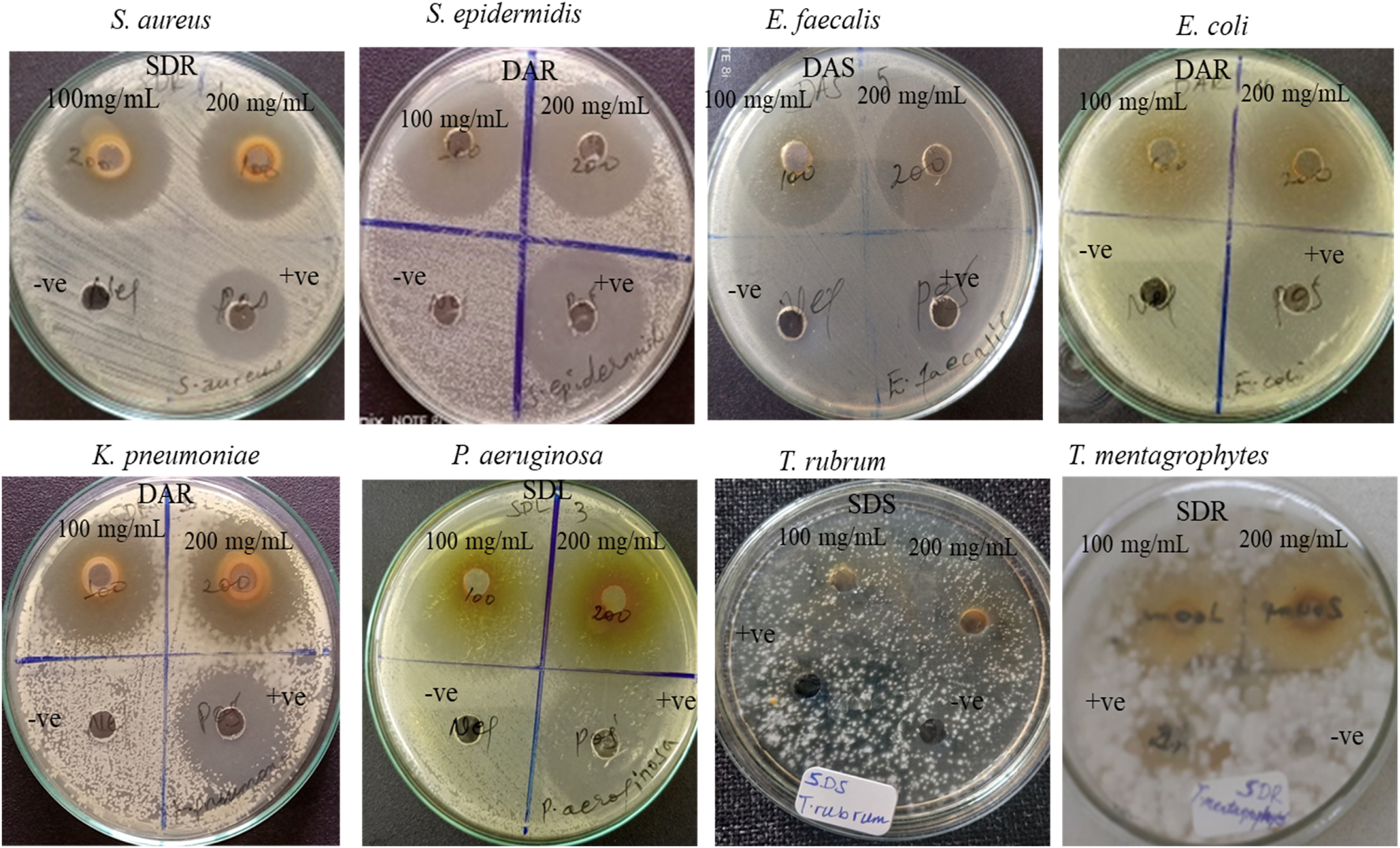 Examples of Antimicrobial activity of S. dasyphyllum and D. abyssinica extracts from soot, stem, and leaf were tested using agar diffusion against S. aureus, S. epidermidis, E. faecalis, E. coli, K. pneumoniae, P. aeruginosa, C. albicans, T. mentagrophytes, and T. rubrum at 100 and 200 mg/mL concentrations. Key notes: Extract type SDR= S. dasyphyllum root, SDS= S. dasyphyllum stem, SDL= S. dasyphyllum leaf, DAR=D. abyssinica root and DAS=D. abyssinica stem.