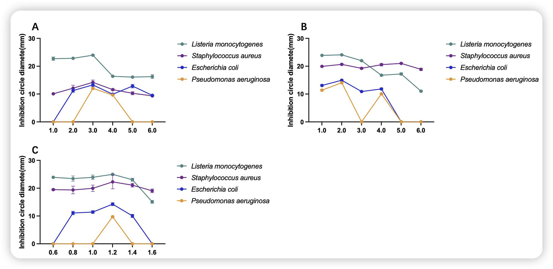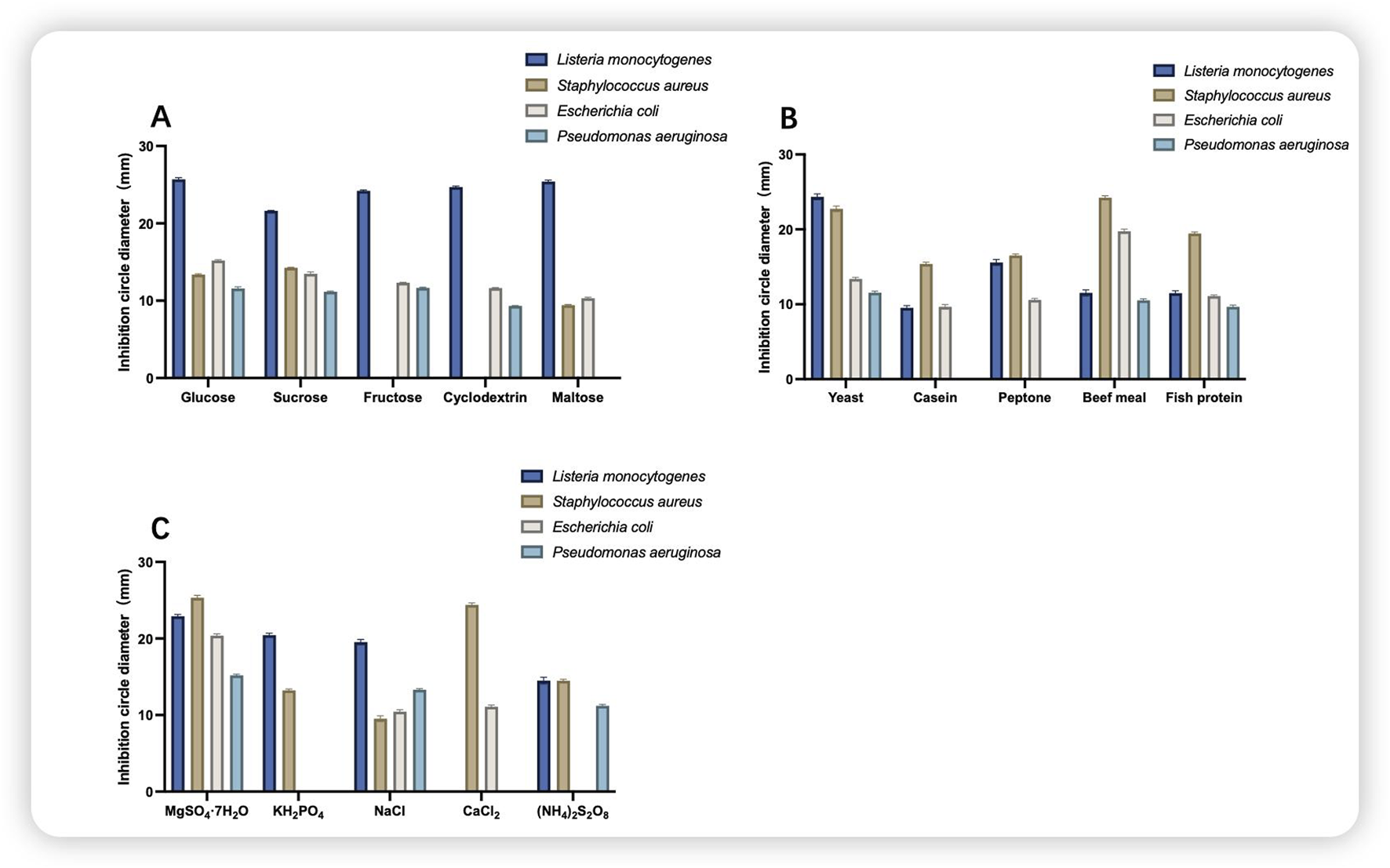 Figure 3 shows the single-component screening of the medium, which comprises glucose as a single carbon source, yeast as a single nitrogen source, and MgSO4·7H2O as a single inorganic salt. The antimicrobial agents were effective against all four indicator bacteria, with the greatest inhibition observed against S. aureus and L. monocytogenes, both of which were greater than 20 mm in diameter.