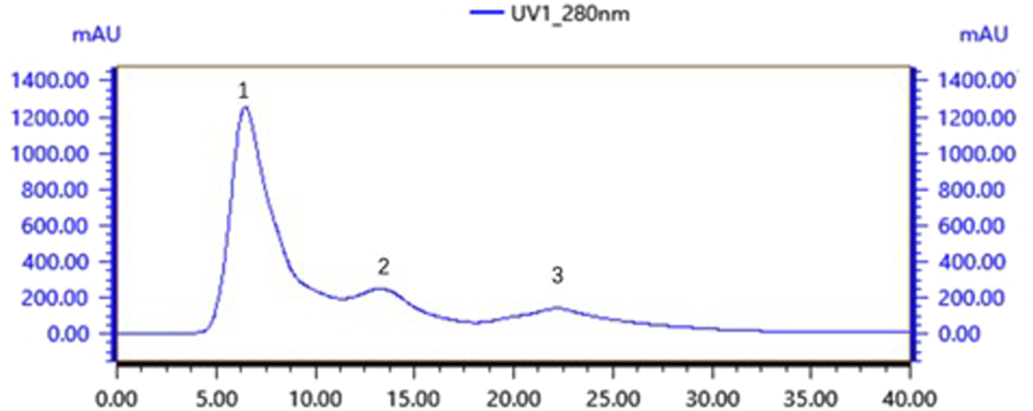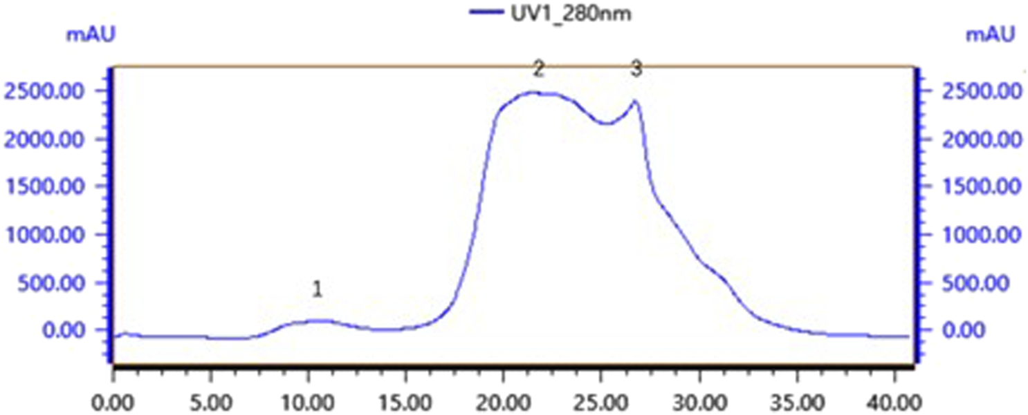 The optimised culture conditions for B. velezensis G7 consisted of a liquid volume of 30 mL, an inoculum volume of 2%, an incubation temperature of 30°C and an incubation time of 24 h. The culture was subsequently centrifuged at 4°C for 30 min at 8000 rpm, and the supernatant was concentrated 10-fold using a rotary evaporator, followed by filtration through a 0.22 μm filter membrane. The concentrated crude extract was loaded onto a deionised water-equilibrated TA-GF75 gel column and subjected to purification at a flow rate of 0.55 mL/min. The obtained fraction with bacteriostatic effects was concentrated and loaded onto a Tiderose Q HP anionic column equilibrated with 1 mol/L NaCl and subjected to anionic column purification at a flow rate of 3 mL/min (Ma et al., 2025). The fraction with bacteriostatic activity was then concentrated and subjected to RP‒HPLC separation and purification. This process consisted of mobile phase A (ddH2O+0.1% TFA) and mobile phase A (acetonitrile+0.1% TFA). The elution procedure was as follows: 5% B; 11–20 min, 5%–50% B; 21–30 min, 50%–70% B; and 31–38 min, 70%–95% B. The bacteriostatic activity of the isolated bacteriocin was detected via the solid agar perforation method and the micro broth twofold dilution method. The bacteriocins were concentrated and stored at −80°C for later use. The molecular weights of the bacteriocins were determined via Tricine-SDS‒PAGE. The gels were electrophoresed at 30 V for 1 h and then electrophoresed at 100 V, after which the gels were stained with Coomassie blue (Peng et al., 2024).