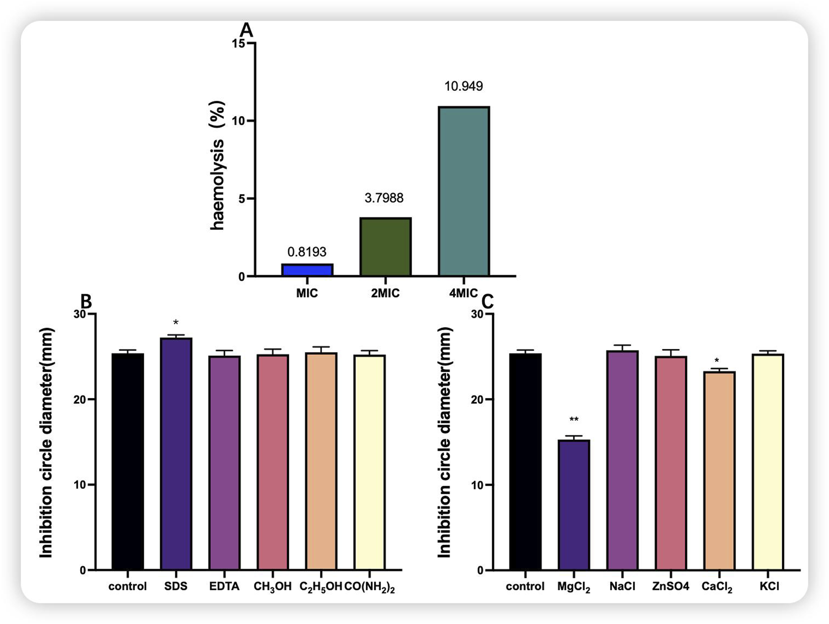 The bacteriocin was divided into five equal portions (1 mL), and 10 μL of NaCl, CaCl2, KCl, ZnSO4, or MgCl2 at a concentration of 2 mol/L was added and mixed. Bacteriocin without inorganic salts was used as a control, and the inhibitory activity of the mixtures was measured by solid agar perforation to test the effect of the inhibitory activity of the bacteriocin via different metal ions.