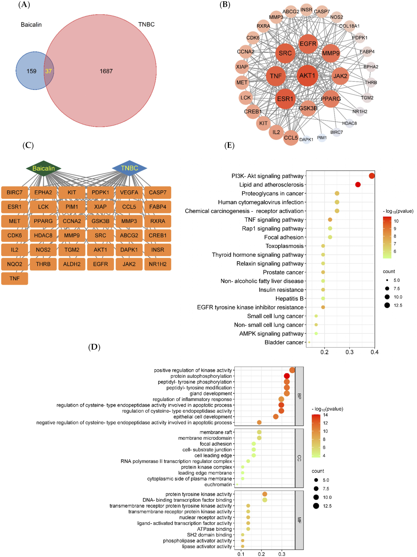 BA network pharmacology analysis. (A) The targets of BA intersect with the targets of TNBC. (B) Protein-protein interaction (PPI) network of baicalin. The node represents the protein, and the edge represents the correlation between the proteins. The size and color depth of the nodes are positively correlated with their degrees, the larger the node is, the greater the corresponding degree is, and the greater the corresponding degree of red is. (C) The “BA-Target-TNBC” network, (D) BA-TNBC GO Bubble Chart, Bubble diagram of biological processes (BP). Bubble diagram of cellular components (CC). Bubble diagram of molecular functions (MF). The Y-axis and X-axis of the above three plots indicate the full names of processes and gene ratios, respectively. The color and size of each bubble are based on P-value and gene counts, respectively. (E) BA-TNBC KEGG Bubble Chart. Node size and color are proportional to the size of the degree value.