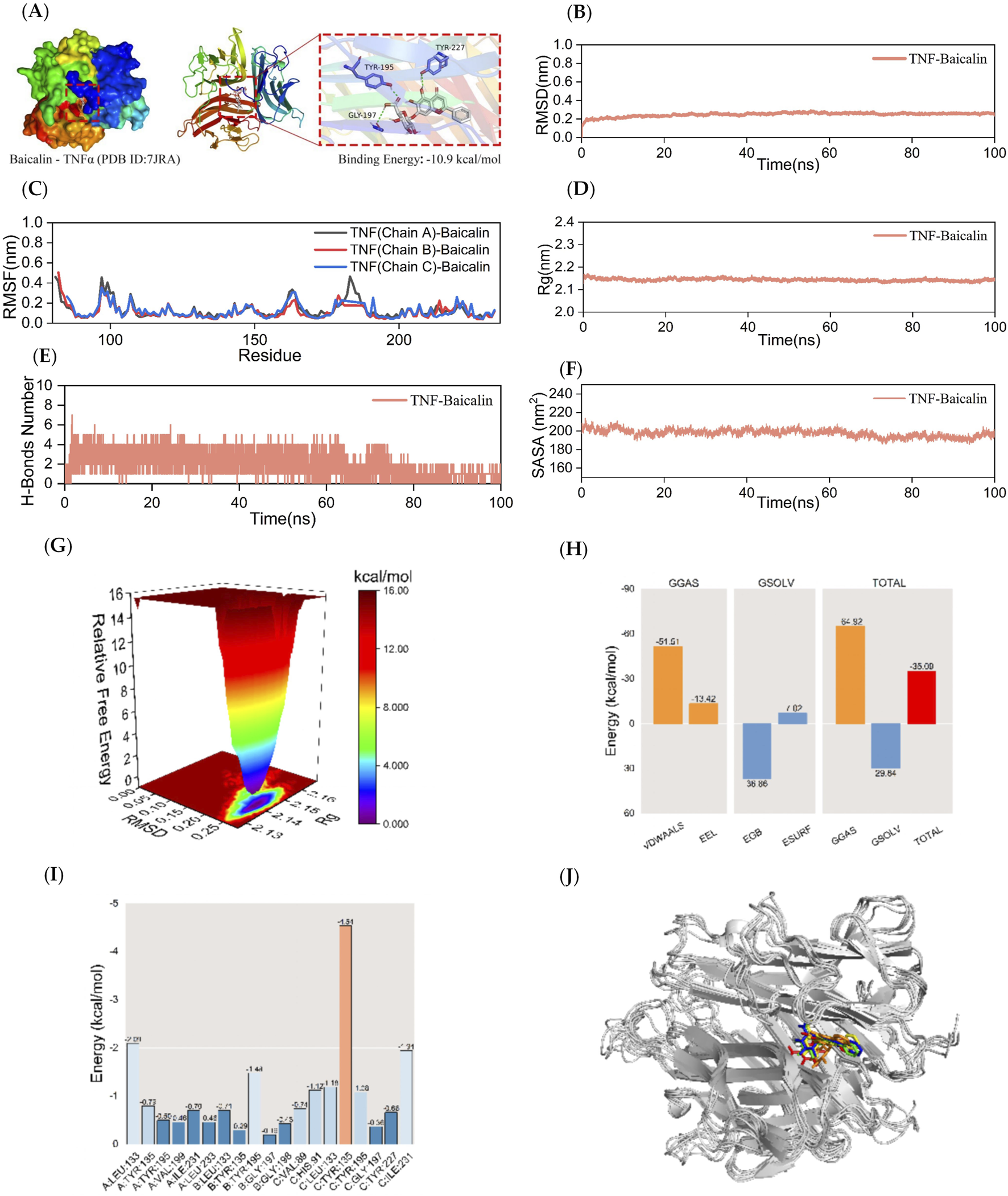 Kinetic simulations of TNF-BA molecular docking molecules with their complexes. The figure represents the kinetic simulations of TNF-α-BA molecular docking and their complexes. Panel (A) shows the visualization of the docking and binding interaction of TNF-α-BA molecules. The protein structure is depicted in various colors, with small white molecules representing BA, small purple molecules indicating amino acid residues in the protein that interact with the ligand, and green dashed lines representing hydrogen-bonding interactions. Panel (B) represents the RMSD curves of the TNF-α-BA complexes, while Panel (C) shows the RMSF curve of the TNF-α-BA complex. The Rg curve of the TNF-α-BA complex is displayed in Panel (D), and Panel (E) illustrates the fluctuation curves of the number of hydrogen bonds formed between TNF-α and BA. The SASA curves of the TNF-α-BA complexes are presented in Panel (F), and the free energy distribution of the TNF-α-BA complexes is shown in Panel (G). Panel (H) details the average binding free energy of TNF-α-BA, including components such as VDWAALS (van der Waals force), EEL (electrostatic energy), EGB (polar solvation energy), ESURF (non-polar solvation energy), GGAS (molecular mechanics term), GSOLV (solvation energy term), and TOTAL (average binding free energy). Panel (I) highlights the energy contributions of amino acid residues involved in BA binding to TNF-α. Lastly, Panel (J) provides comparative structural plots of the TNF-α-BA complex at five moments during molecular dynamics simulations: 0, 25, 50, 75, and 100 ns.