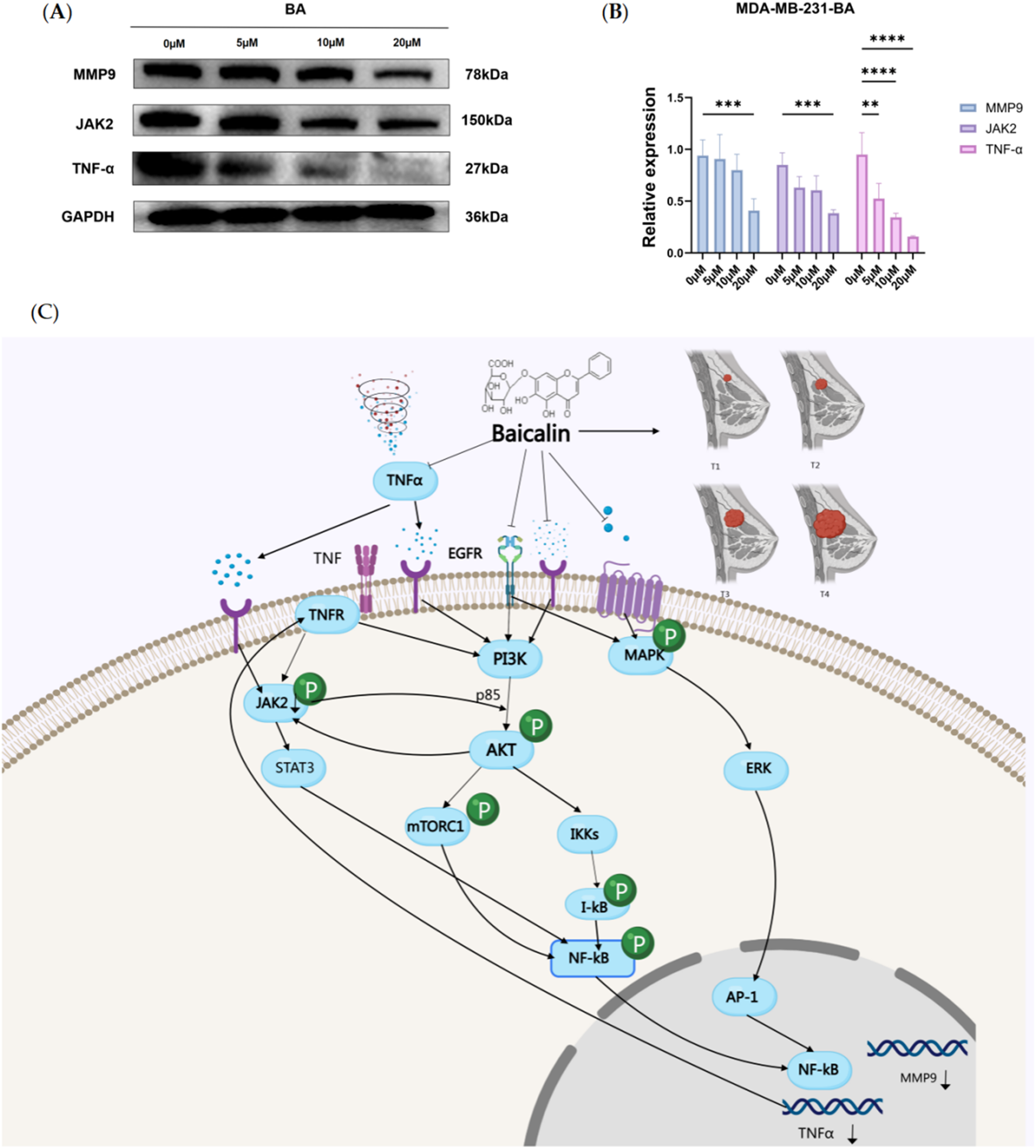 Baicalin inhibits the protein expression of MMP9, TNF-α and JAK2 and their related signaling pathways in the treatment of triple-negative breast cancer.