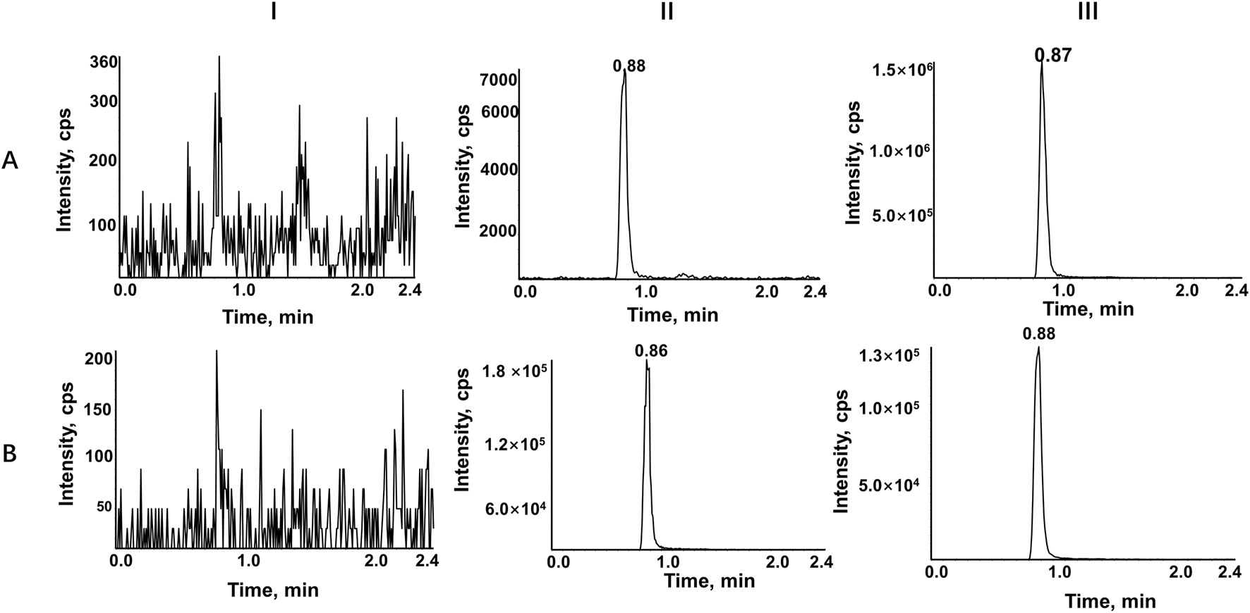 Representative chromatograms of RIBO (A), and RIBO-d6(B). Ⅰ, a blank rat plasma sample; Ⅱ, a blank rat plasma sample spiked with the working solution at LLOQ level and IS; Ⅲ, a rat plasma sample after oral administration of 60 mg/kg RIBO.
