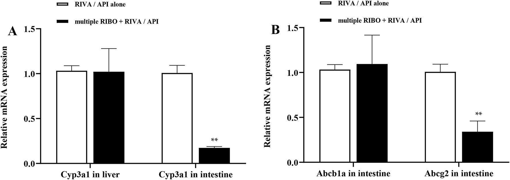 Ribociclib significantly increased exposure to both rivaroxaban and apixaban, with a greater impact on rivaroxaban. Specifically, ribociclib increased the AUC0-t, AUC0- and Cmax of rivaroxaban (normal dose) by about 2.4-fold, 2.1-fold and 1.8-fold, while increasing apixaban exposure by about 60.82%, with a trend towards an increase in Cmax that was not statistically significant. When co-administered with ribociclib, even at a reduced dosage of 1 mg/kg, rivaroxaban exhibited a significant increase in exposure, with the AUC increasing by 2.3-fold and Cmax by 1.3-fold. Despite the reduction in dosage, the pharmacokinetic effect of ribociclib on rivaroxaban persisted. While administration of rivaroxaban 12 h after ribociclib resulted in a less pronounced increase in exposure compared to the normal-dose group. The results of qRT-PCR showed that ribociclib reduced the expression of Cyp3a1 and Abcg2 in rat intestine.