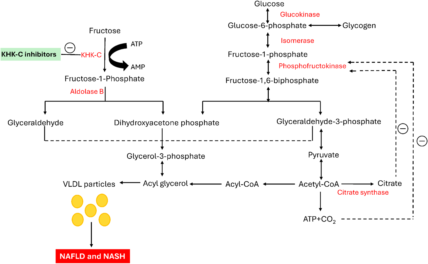 The modern Westernized diet, which incorporates highly refined sugars, has been linked to various metabolic disorders, including obesity, non-insulin-dependent diabetes mellitus (NIDDM), atherogenic dyslipidemia, non-alcoholic fatty liver disease (NAFLD), and non-alcoholic steatohepatitis (NASH). (Elliott et al., 2002; Basciano et al., 2005; Jung and Choi, 2014; Kopp, 2019; Kazierad et al., 2021). Among these sugars, fructose is widely used as a sweetening ingredient in various processed food products consumed daily, such as soft drinks and desserts. (Chen et al., 2017). Diets rich in fructose induce a wide range of metabolic disturbances in both humans and animal models (Raben et al., 2002; Maryanoff et al., 2011). Fructose is primarily metabolized in the liver, where it bypasses the key regulatory checkpoint of phosphofructokinase (PFK) in glycolysis, unlike glucose (Mayes, 1993; Swarbrick et al., 2008; Stanhope et al., 2009; Eberhart et al., 2020; Zhu et al., 2023). When fructose enters the liver, it is converted by ketohexokinase into fructose-1-phosphate (F1P) utilizing adenosine triphosphate (ATP) as a cofactor (Figure 1). F1P is then split by Aldolase B into two triose sugars: glyceraldehyde and dihydroxyacetone phosphate (DHAP). These molecules are subsequently converted into glyceraldehyde-3-phosphate (G3P), which feeds into the glycolytic pathway, producing acetyl-CoA. Acetyl-CoA plays a crucial role in fatty acid synthesis, leading to the creation of triglycerides (Shepherd et al., 2021; Koene et al., 2022). These triglycerides are packaged into VLDL particles and transported into the bloodstream, increasing triglyceride levels (Zhang et al., 2011). Unlike glucose, fructose metabolism lacks regulation by high-energy signals like ATP or citrate, meaning KHK-C continues to drive the pathway without inhibition. This leads to continuous production of glycerol-3-phosphate and acetyl-CoA, contributing to excess fat accumulation in the liver. This unregulated pathway is a significant cause of non-alcoholic fatty liver disease (NAFLD), elevated blood triglycerides (hypertriglyceridemia), and increased risk of cardiovascular diseases (Jensen et al., 2018; Elsaman and Mohamed, 2025). Chronic high fructose consumption leads to insulin resistance and metabolic syndrome, both of which increase the risk of developing type 2 diabetes (Taskinen et al., 2019). Unlike glucose, which is stored as glycogen, fructose is more readily converted into fat, exacerbating metabolic issues. The overconsumption of fructose, particularly from sugary foods, underscores the importance of understanding its role in modern health challenges (Ting, 2024).