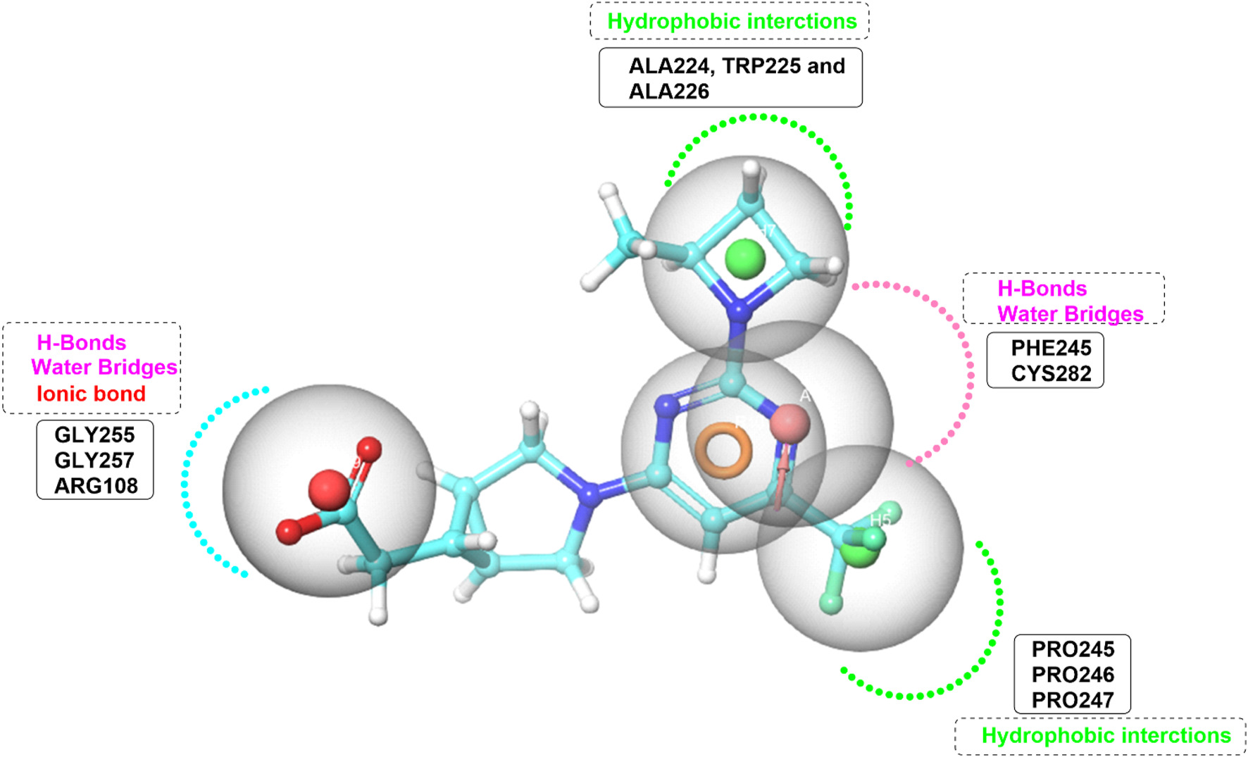 Figure 5. Pharmacophore Model Depicting Interaction Forces and Residues in the KHK-C Binding Site. Hydrophobic interactions (green color), Hydrogen bond acceptors (HBA) (pink color), and ionic bond (red color).