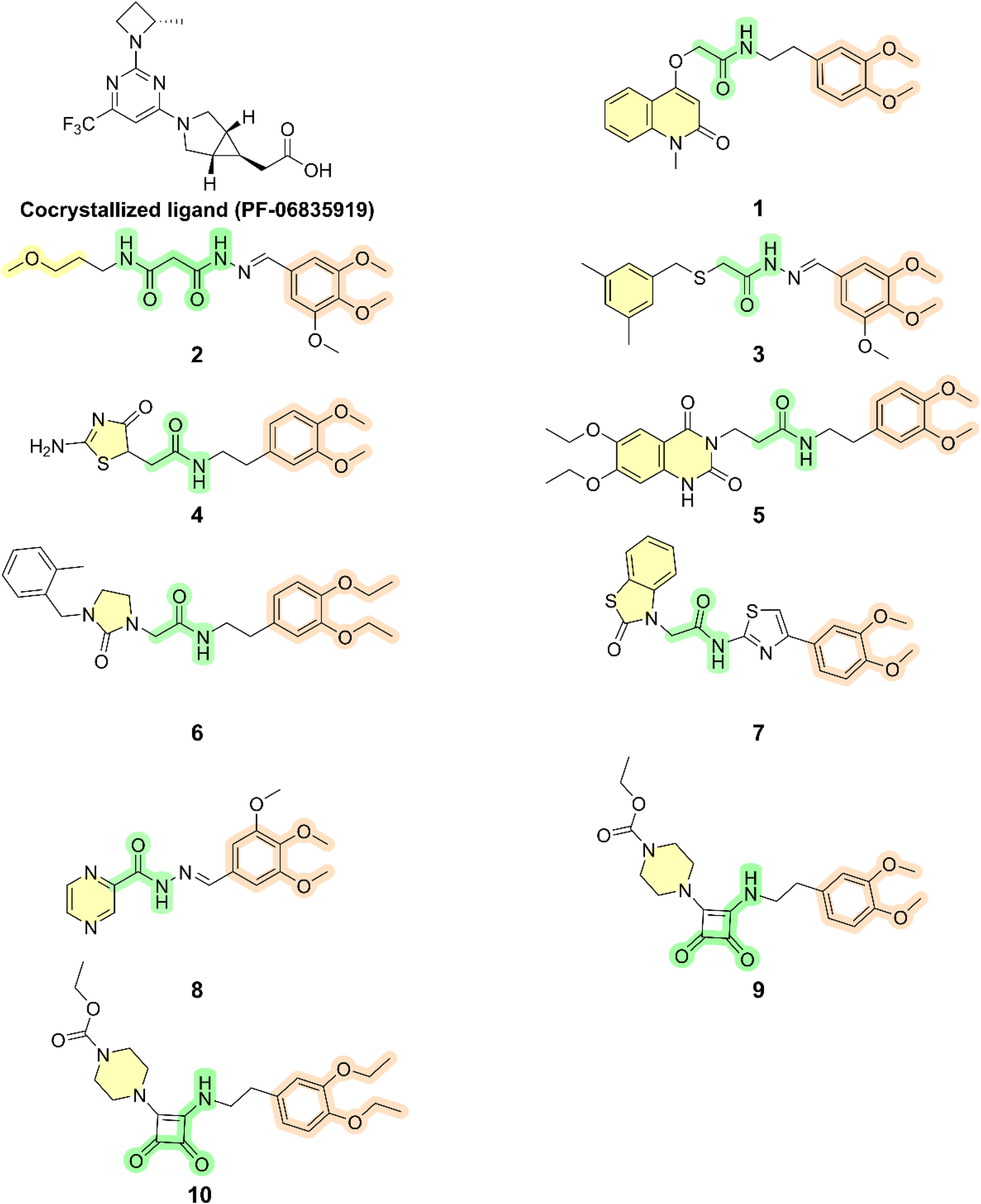 The number of predicted metabolic reactions for hits 1–10 ranged from 4 to 7, indicating moderate metabolism in the liver. This suggests that the compounds may reach their site of action in their intact forms. However, their metabolic stability is slightly lower than LY-3522348, which is predicted to undergo only 1 metabolic reaction. The higher metabolic stability of LY-3522348 may need to be considered for optimization in the identified hits.