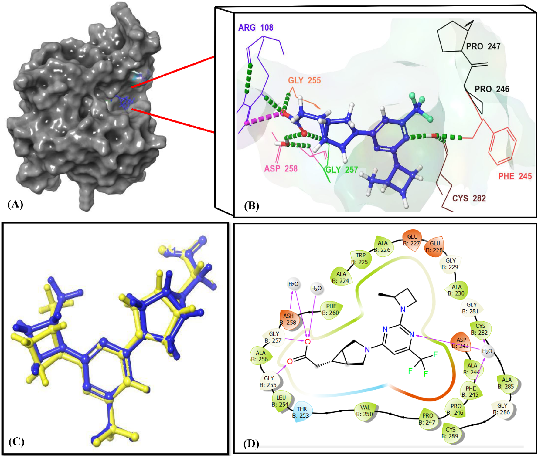 Figure 7. Interactions of the reference ligand PF-06835919 with the KHK-C binding site (PDB ID: 6W0Z). Panel (A) shows the crystal structure of the target enzyme bound to PF-06835919. Panels (B, D) depict the 3D and 2D enzyme-ligand interactions, respectively. In Panels (B, D), the binding site residues (Phe245, Pro246, Pro247, Pro248, Gly255, Gly257, ASH258, and Cys282) are indicated using their three-letter amino acid codes. H-Bonds are represented by green dotted lines in Panel (B) and by magenta lines in Panel (D). Panel (C) illustrates the superimposition of the docked reference ligand PF-06835919 (in blue) with the original ligand (in yellow), showing an RMSD value of 0.245 Å.
