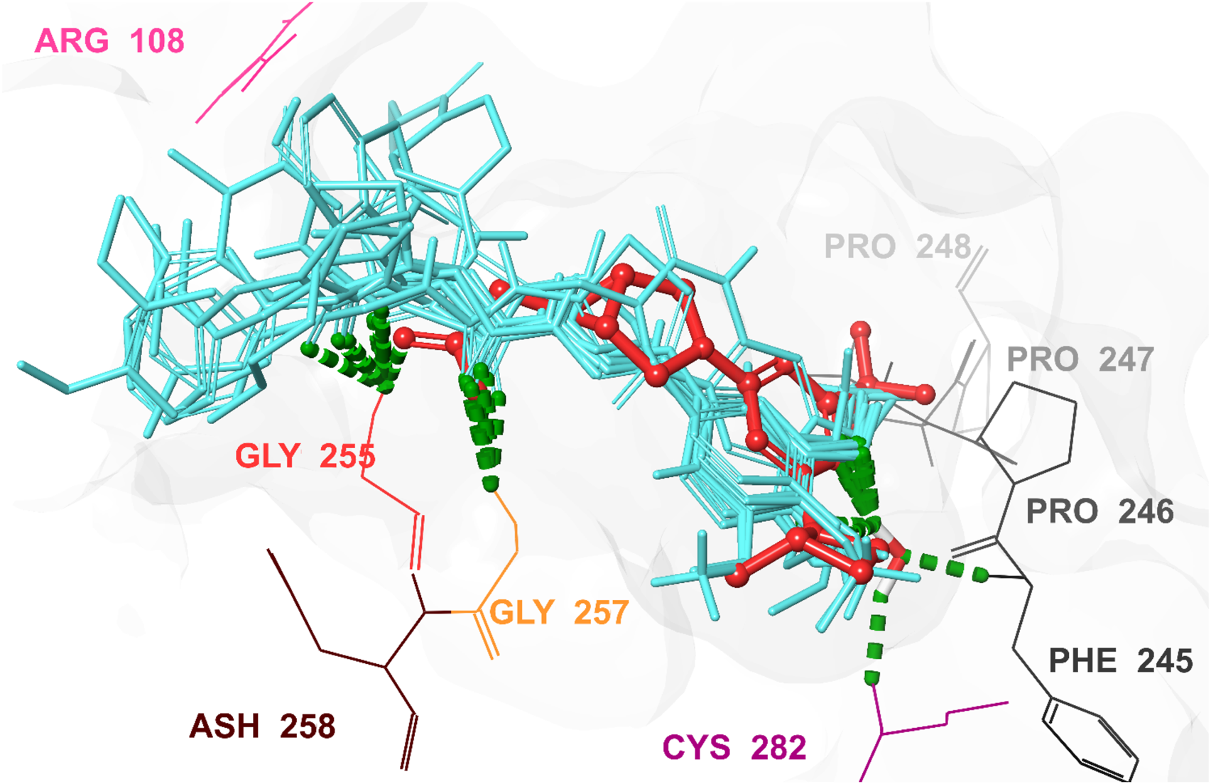 Figure 9. 3D interaction pattern of the docked top-ranked hits and the co-crystallized Ligand in the KHK-C binding site (PDB ID: 6W0Z). This figure illustrates the 3D interaction pattern of the docked top-ranked hits and the co-crystallized ligand in the human KHK-C binding site (PDB ID: 6W0Z). Key interacting residues, including Arg108, Phe245, Pro246, Pro247, Pro248, Gly255, Gly257, and Cys282, are highlighted. The co-crystallized ligand is displayed in red, while the superimposed top-ranked hits are shown in cyan, providing a clear comparison of their binding modes and interactions within the active site.