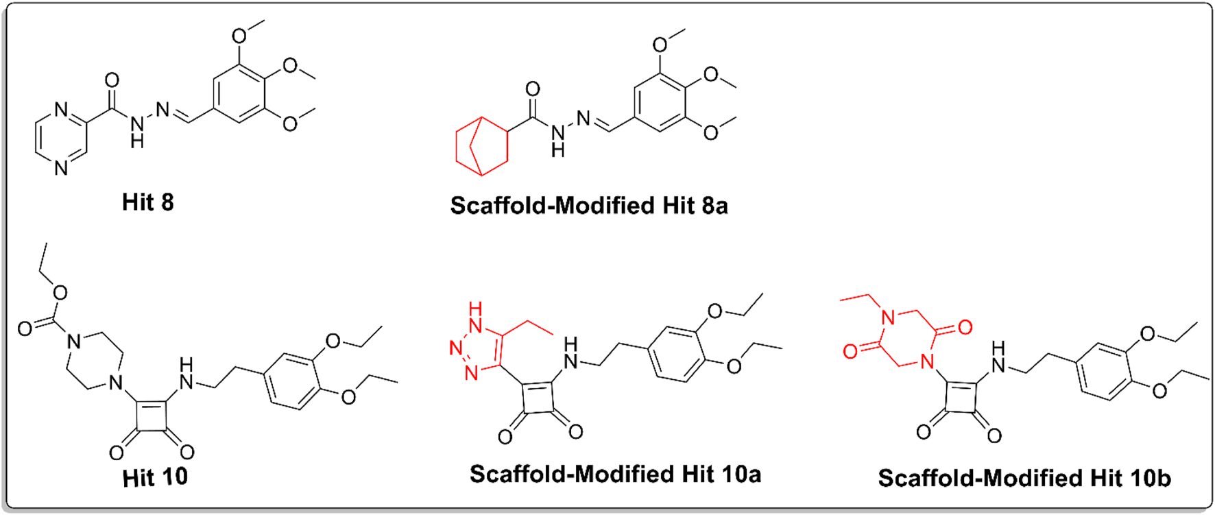 Figure 11. Chemical structures of hit 10, scaffold-modified hit10a, scaffold-modified hit 10b, hit 8, and scaffold-modified hit8a, illustrating the structural modifications made to reduce cardiotoxicity. The replaceable groups, highlighted in red, indicate the modifications.