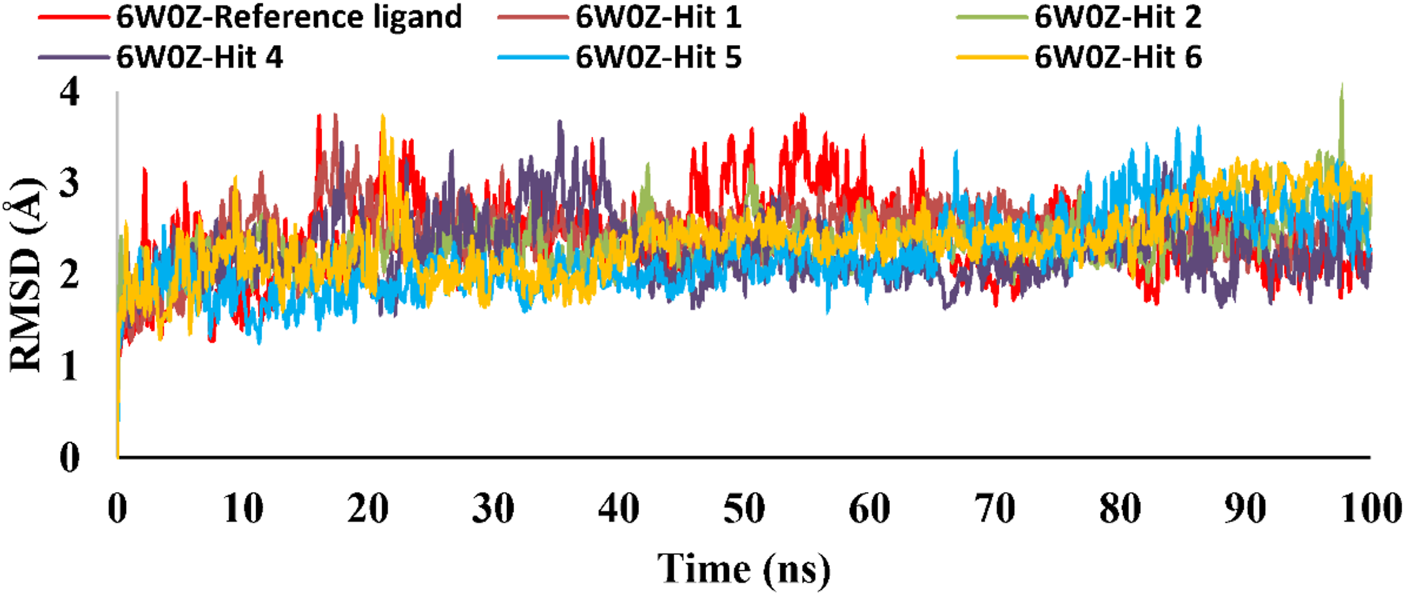 Figure 12. RMSD plot for the simulated docked complexes of the top-ranked hits 1,2, and 4-6 as well as the reference ligand during 100 ns MD simulations. The X-axis represents the time in ns and the Y-axis represents the RMSD value of each complex in Å.