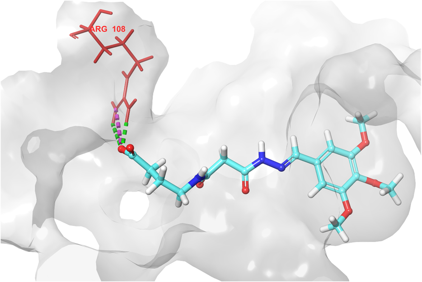 Figure 14. 3D interaction diagram of the designed hit 2 analog, showing the ionic interaction and two hydrogen bonds between the newly introduced carboxylate group and Arg108.