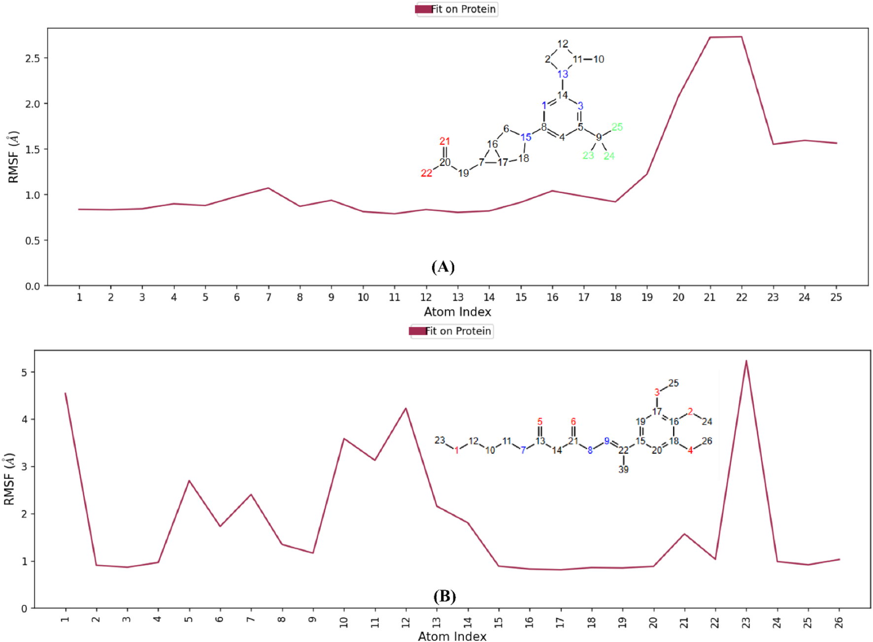 Figure 16. RMSF analysis of ligand dynamics in the KHK-C binding pocket. (A) Co-crystallized ligand (B) Hit 2.