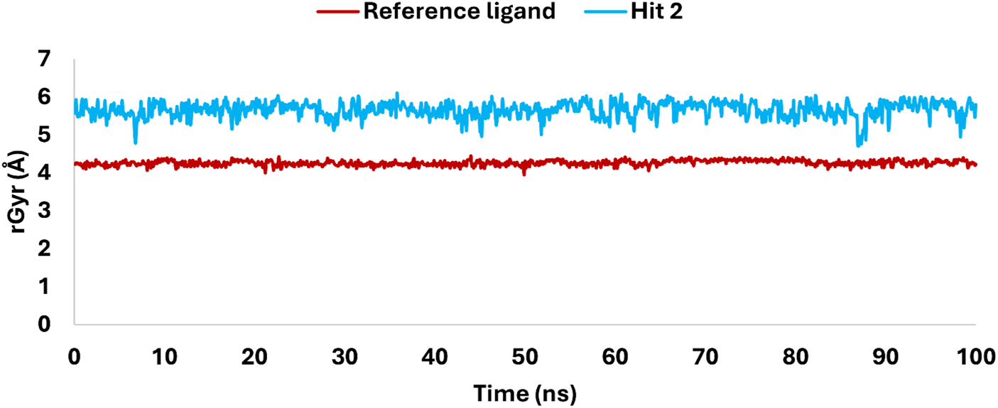 Figure 17. Variations in rGyr of hit 2 and the reference ligand, highlighting flexibility and structural rigidity within the KHK-C catalytic site.