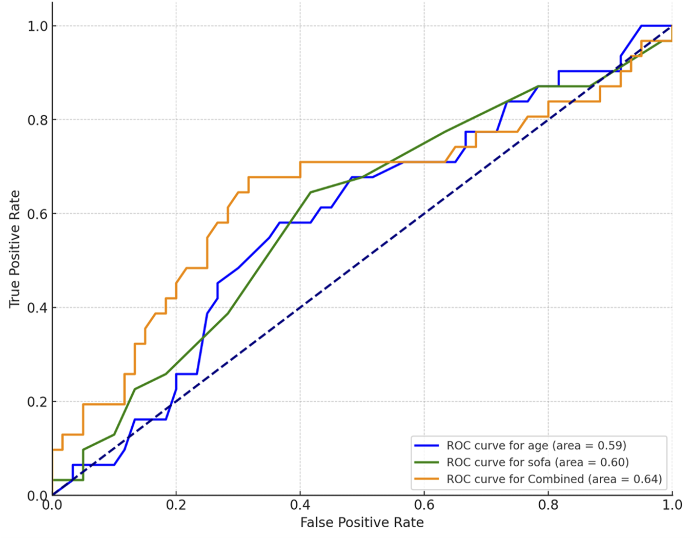 To assess the predictive capability of these metrics, Receiver Operating Characteristic (ROC) curves were plotted. The analysis highlighted the combined predictive impact of age and SOFA score, noting the minimal predictive value of body temperature alone (area under the ROC curve <0.5). As depicted in Figure 2, the ROC curve analysis emphasizes the substantial predictive power of these combined metrics for predicting mortality in sepsis patients, underscoring the clinical importance of age and severity of organ failure.