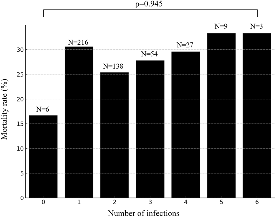 In our study of 453 patients, 98.7% (447/453) experienced co-infections, with the number of co-infecting pathogens ranging from zero to six, as shown in Figure 3. Detailed analysis revealed that patients with a single pathogen co-infection had a mortality rate of 16.7%. In contrast, those with dual or more pathogen co-infections exhibited increased mortality rates between 25.4% and 33.3%, with the rate peaking at 33.3% among patients co-infected with five to six pathogens (p-value = 0.945), as depicted in Figure 3. To further explore the impact of co-infections on survival, we conducted Kaplan-Meier survival analysis. The resulting curves, illustrated in Figure 3, compare survival probabilities across groups with different levels of pathogen co-infection. However, the number of co-infecting pathogens did not significantly affect the 28-day mortality rate (P = 0.9), as shown in Figure 4.