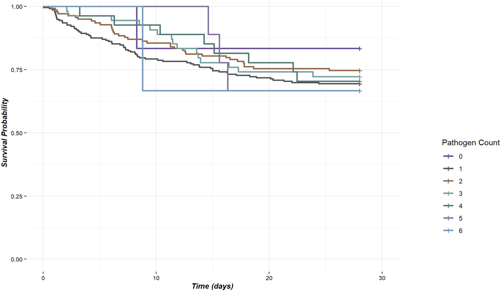 Kaplan-Meier survival curve curves for co-infections with different numbers of pathogens.