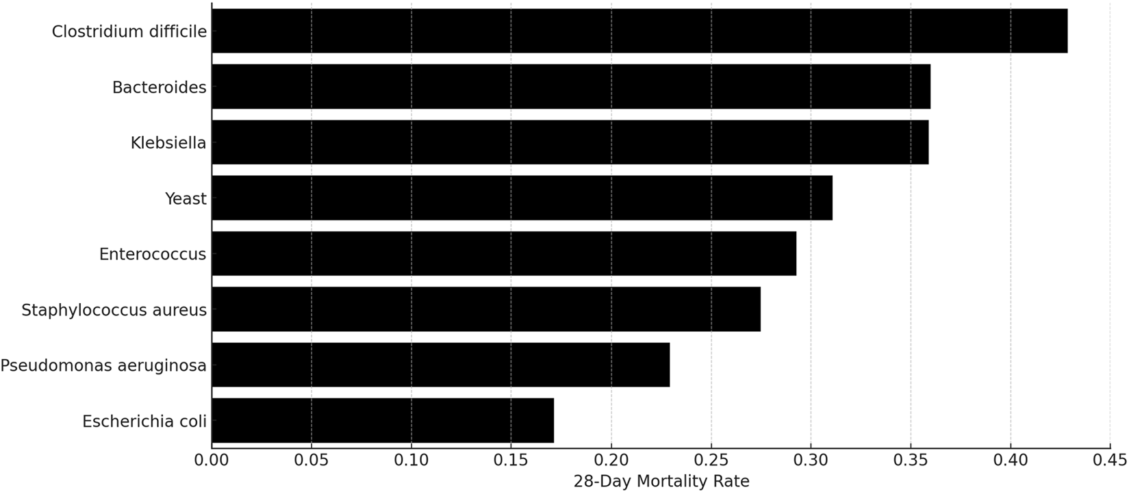 In our study, a high prevalence of co-infections was observed, with 447 out of 453 patients having multiple pathogenic infections alongside MRSA. We conducted a comprehensive analysis to assess the impact of these co-infecting organisms on the 28-day mortality rates. This analysis focused on pathogen groups with a minimum of 15 patients each (N ≥ 15). The results, shown in Figure 6, identified the eight pathogen groups with the most significant impact on mortality: Clostridium difficile, with a mortality rate of 43%; Bacteroides at 36%; Klebsiella spp. at 36%; Yeast at 31%; Enterococcus at 29%; S. aureus at 27%; Pseudomonas aeruginosa at 23%; and Escherichia coli at 17%.
