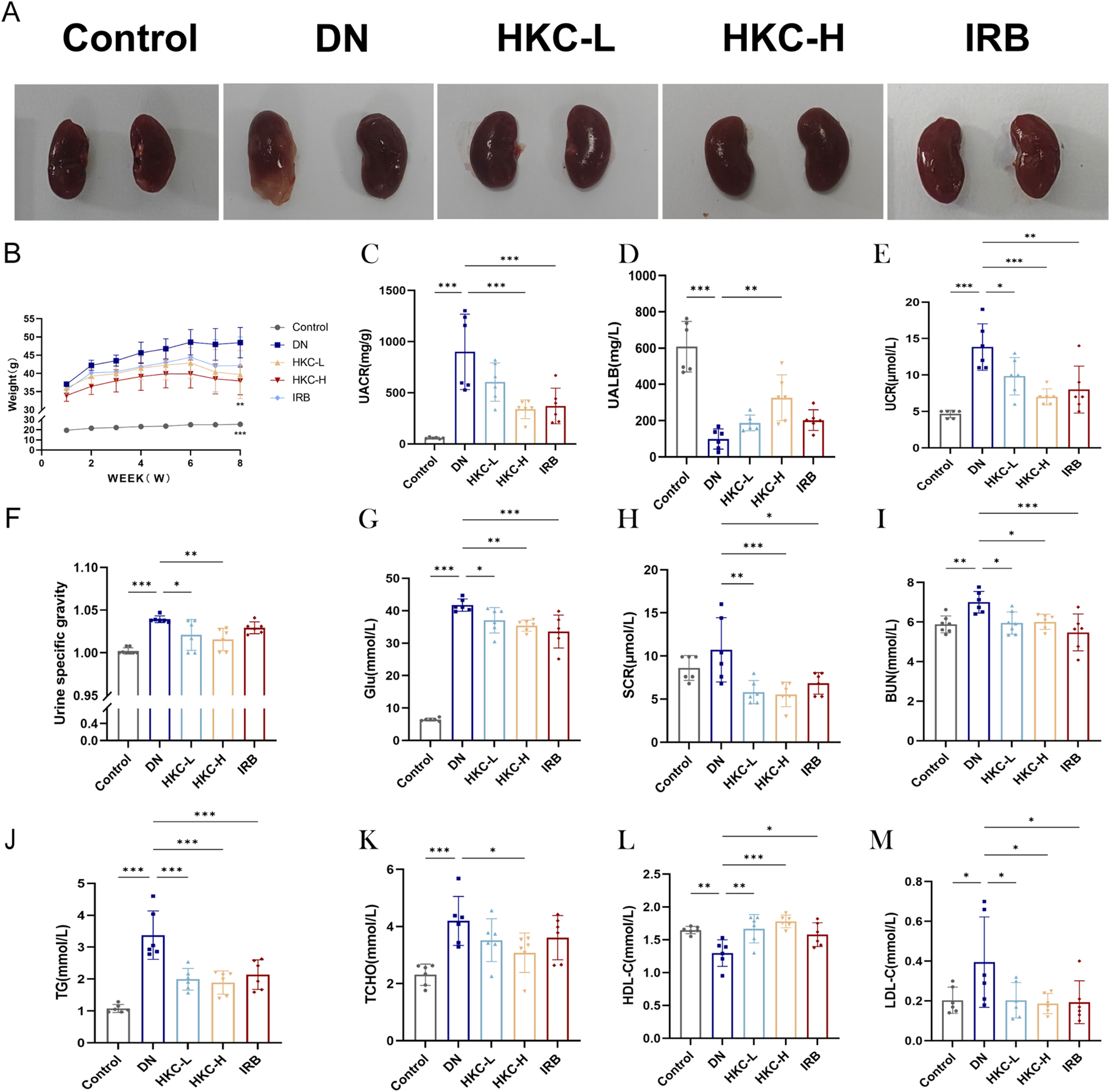 Effects of HKC on DN mice and analysis of blood and urine biochemical indexes. (A) Kidney morphology changes in mice; (B) Body weight changes in mice administered for 8 weeks; (C) Urinary albumin/creatinine ratio (ACR) level in urine; (D) Urinary albumin (UALB) level in urine; (E) Urinary creatinine (UCR) level in urine; (F) Specific gravity (SG) level in urine; (G) Blood glucose (Glu) level; (H) Serum creatinine (SCR) level; (I) Serum urea nitrogen (BUN) level; (J) Serum triglyceride (TG) level; (K) serum total cholesterol (TC) level; (L) serum high-density lipoprotein (HDL-C) level; (M) low-density lipoprotein (LDL-C) level. (*P < 0.05, **P < 0.01, ***P < 0.001, n = 6).