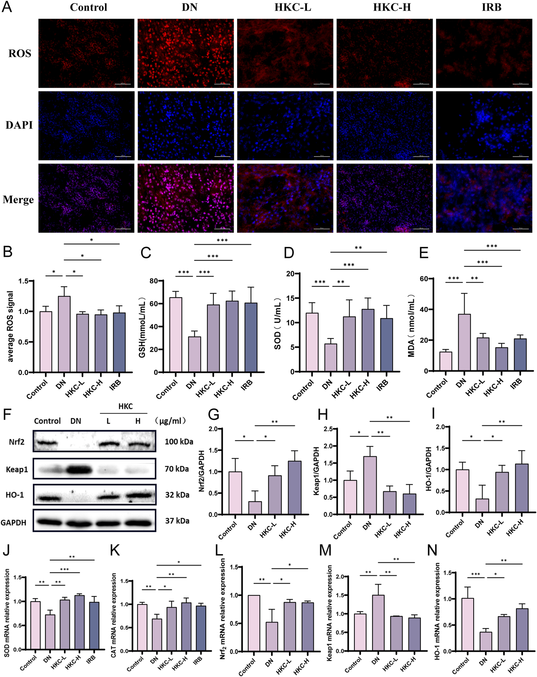 HKC ameliorates DN by regulating oxidative stress through Keap1/Nrf2/HO-1 pathway in vivo. (A) Fluorescence probe to detect the level of ROS in mouse kidney; (B) Quantitative analysis of ROS level in mouse kidney (n = 4); (C) GSH content in serum of mice (n = 4); (D) SOD content in serum of mice (n = 4); (E) MDA content in serum of mice (n = 4); (F) Western blot analysis of Nrf2, Keap1 and HO-1 in mouse kidney; (G) Quantitative analysis of Nrf2; (H) Quantitative analysis of Keap1; (I) Quantitative analysis of HO-1; (J) SOD mRNA expression in mouse kidney; (K) CAT mRNA expression in mouse kidney; (L) Nrf2 mRNA expression in mouse kidney; (M) Keap1 mRNA expression in mouse kidney; (N) HO-1 mRNA expression in mouse kidney. (*P < 0.05, **P < 0.01, ***P < 0.001, n = 3).