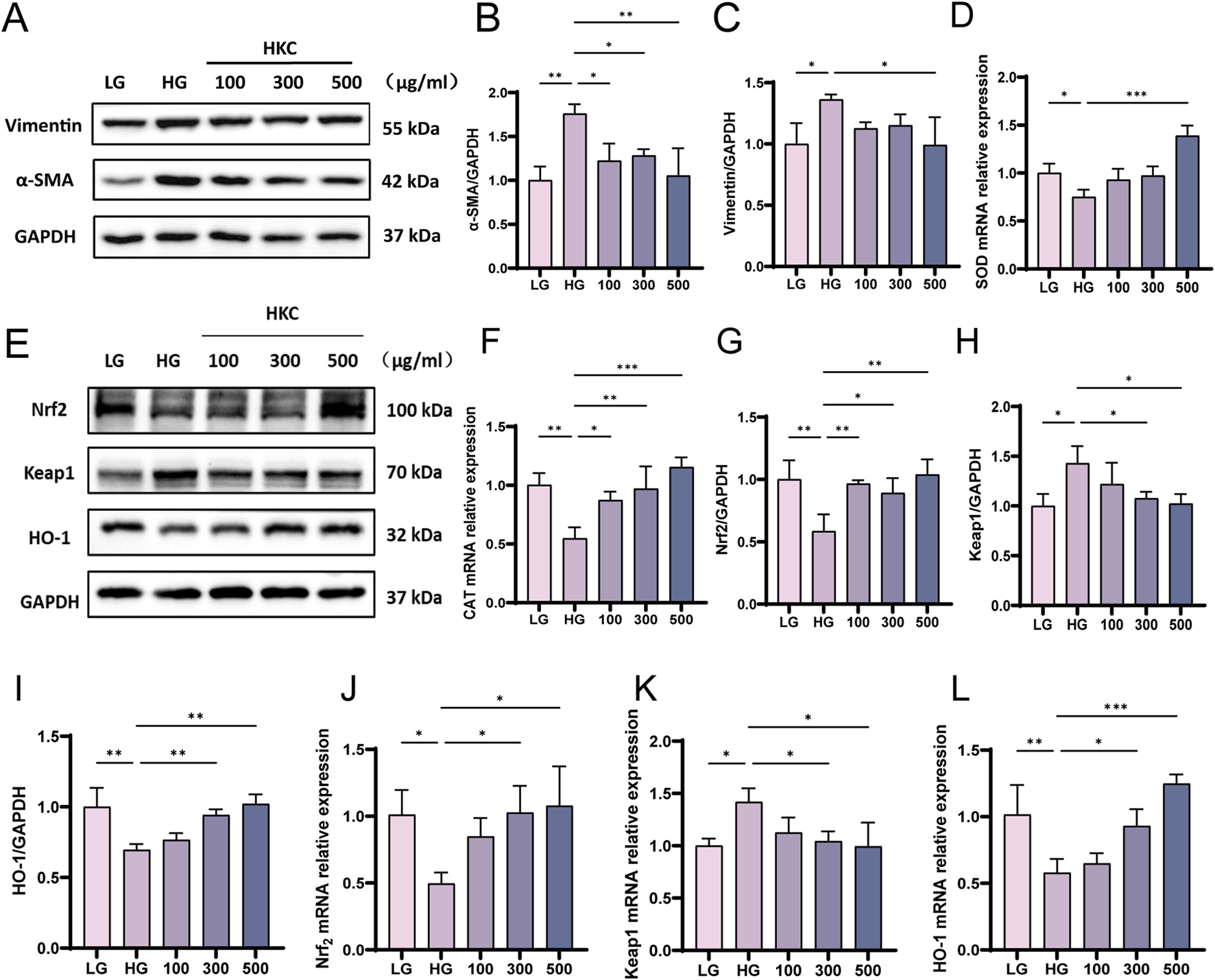 HKC ameliorates DN by regulating oxidative stress through Keap1/ Nrf2/HO-1 pathway in vitro. (A) Western blot analysis of α-SMA and Vimentin in HK-2 cells; (B) Quantitative analysis of α-SMA; (C) Quantitative analysis of Vimentin; (D) SOD mRNA expression in HK-2 cells. (E) Western blot analysis of Nrf2, Keap1 and HO-1 in HK-2 cells; (F) CAT mRNA expression in HK-2 cells. (G) Quantitative analysis of Nrf2 protein expression; (H) Quantitative analysis of Keap1 protein expression; (I) Quantitative analysis of HO-1 protein expression; (J) Nrf2 mRNA expression in HK-2 cells; (K) Keap1 mRNA expression in HK-2 cells; (L) HO-1 mRNA expression in HK-2 cells. (*P < 0.05, **P < 0.01, ***P < 0.001, n = 3).