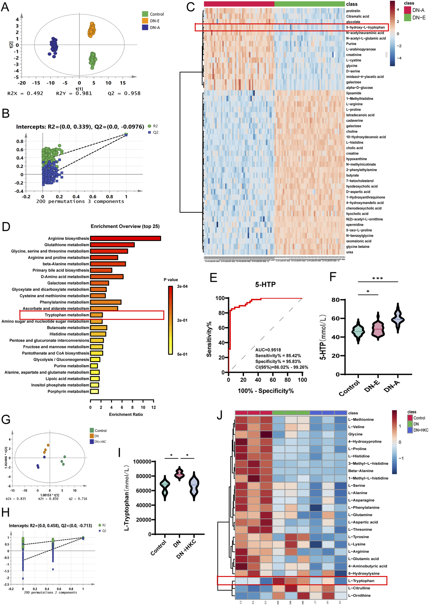 Targeted amino acid metabolomics analysis of clinical patient serum and non-targeted metabolomics analysis of mouse serum. (A) PLS-DA analysis of clinical non-targeted metabolomics (n = 50); (B) Permutation analysis of clinical non-targeted metabolomics; (C) heatmap analysis of clinical non-targeted metabolomics; (D) pathway enrichment analysis of clinical non-targeted metabolomics; (E) Receiver operating characteristic curve of 5-HTP in serum of clinical patients; (F) The level of 5-HTP in serum of clinical patients, (G) PLS-DA analysis of targeted metabolomics in mice (n = 3); (H) Permutation analysis of targeted metabolomics in mice; (I) L-tryptophan content in mouse serum; (J) Heatmap analysis of targeted metabolomics in mice.