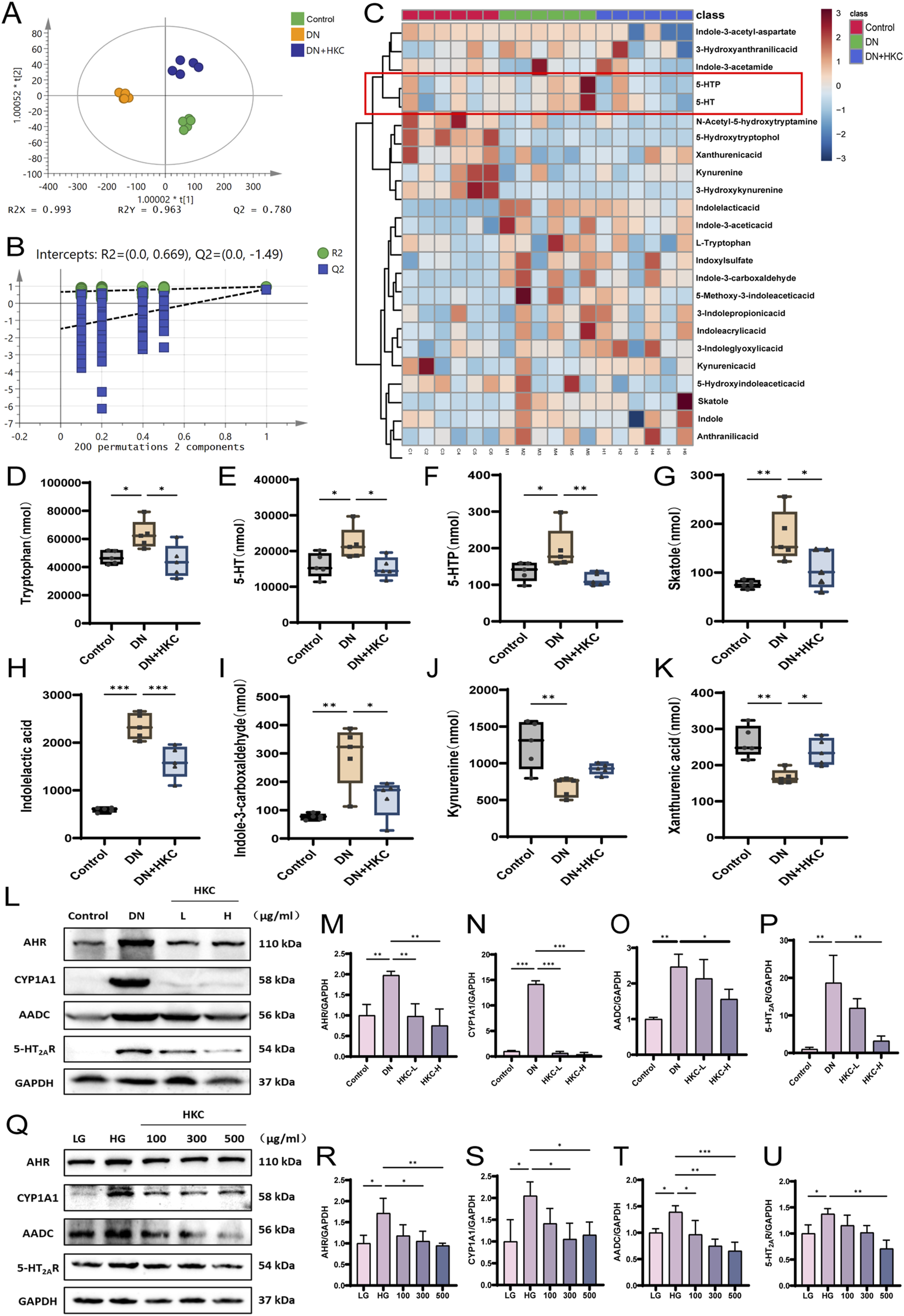 Targeted tryptophan metabolomics analysis of mouse serum and Western blotting verification of tryptophan metabolite-related protein expression in vivo and in vitro. (A) PLS-DA analysis of targeted tryptophan metabolomics in mice (n = 5); (B) Permutation analysis of targeted tryptophan metabolomics in mice; (C) Heatmap analysis of targeted metabolomics in mice; (D) Tryptophan content level; (E) 5-HT content level; (F) 5-HTP content level; (G) Skatole content level; (H) Indolelactic acid content level; (I) Indlole-3-carboxaldehyde content level; (J) Kynureninee content level; (K) Xanthurenic content level; (L) Western blot analysis of AHR, CYP1A1, AADC and 5-HT2AR in mouse kidney. (M) Quantitative analysis of AHR in mice; (N) Quantitative analysis of CYP1A1 in mice; (O) Quantitative analysis of AADC in mice; (P) Quantitative analysis of 5-HT2AR in mice; (Q) Western blot analysis of AHR, CYP1A1, AADC and 5-HT2AR protein in cells; (R) Quantitative analysis of AHR in cells; (S) Quantitative analysis of CYP1A1 in cells; (T) Quantitative analysis of AADC in cells; (U) Quantitative analysis of 5-HT2AR in cells. (*P < 0.05, **P < 0.01, ***P < 0.001, n = 3).