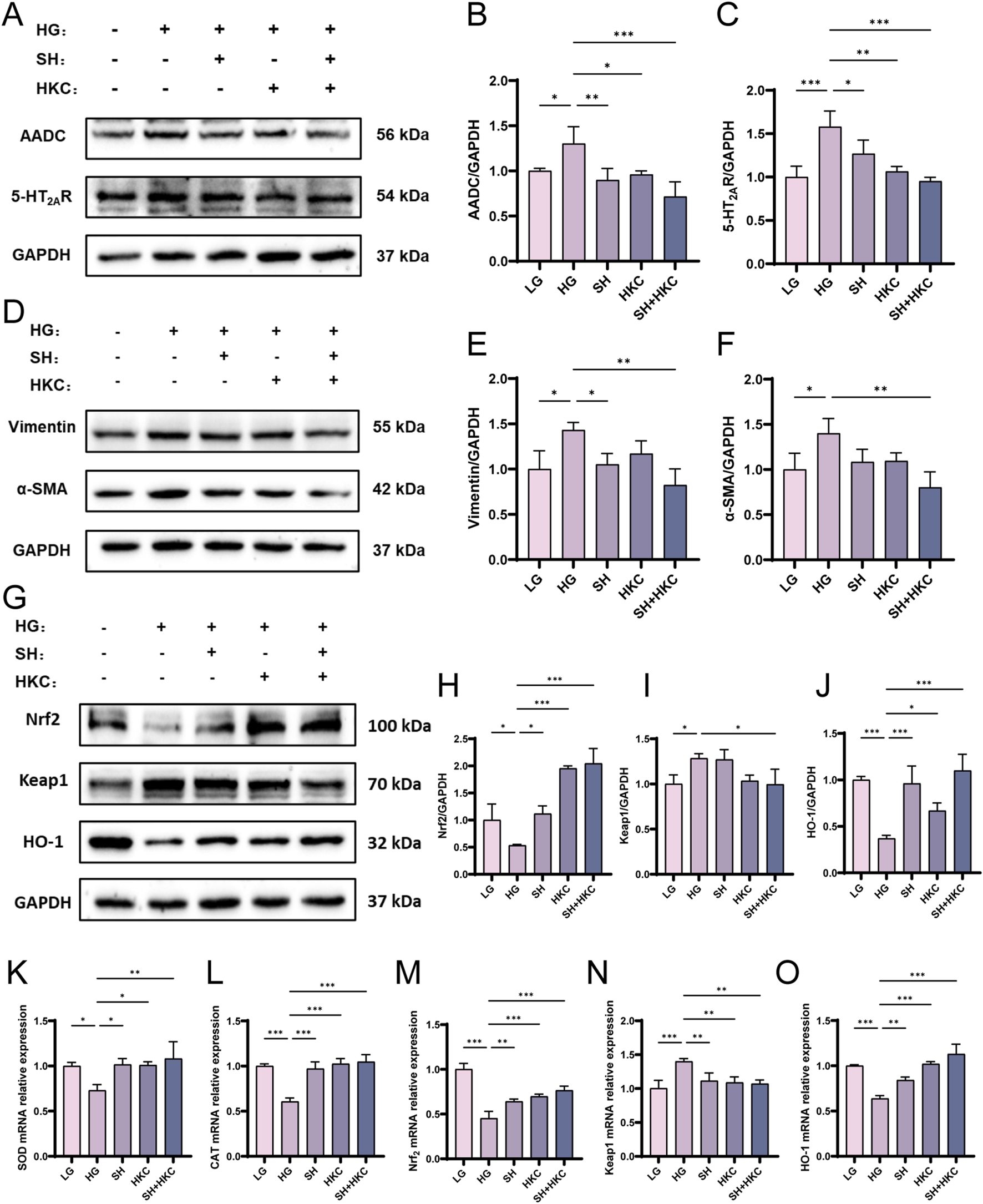 Sarpogrelate hydrochloride inhibits the pharmacodynamic effect of 5-HT in high glucose HK-2 Cells in vitro. (A) Western blot analysis of AADC and 5-HT2AR in HK-2 cells; (B) Quantitative analysis of AADC in cells; (C) Quantitative analysis of 5-HT2AR in cells; (D) Western blot analysis of α-SMA and Vimentin in HK-2 cells; (E) Quantitative analysis of α-SMA in cells; (F) Quantitative analysis of Vimentin in cells; (G) Western blot analysis of Nrf2, Keap1 and HO-1 in HK-2 cells; (H) Nrf2 quantitative analysis; (I) Quantitative analysis of Keap1 in cells; (J) HO-1 quantitative analysis; (K) SOD mRNA expression; (L) CAT mRNA expression; (M) Nrf2 mRNA expression; (N) Keap1 mRNA expression; (O) HO-1 mRNA expression. (*P < 0.05, **P < 0.01, ***P < 0.001, n = 3).