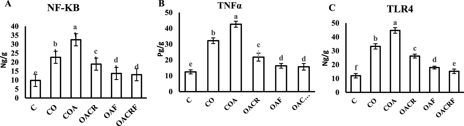 Using of chromium picolinate at dose (400 μg/kg) and inhalation of formoterol at (50 µg/kg) for 15 min once/day in groups (OACRF) and (OAF) showed a significant decrease in (NF-kB), (TNFα) and (TLR4) compared to (C) at P < 0.05 (Figures 4A–C). On the other hand, the groups (CO), (COA), and (OACR), which were not treated with formoterol, showed the highest value of (NF-kB), (TNFα), and (TLR4) (Figures 3A–C).