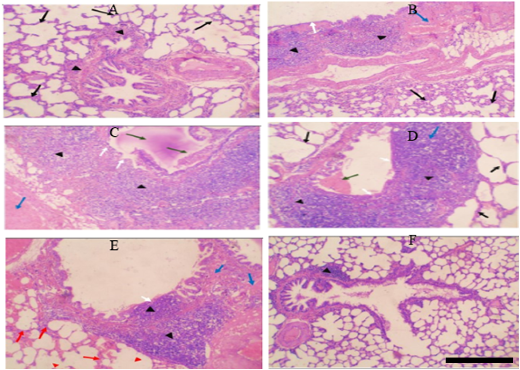 (A) Control group: Normal alveolar walls (black arrows) and bronchioles (black arrowheads). (B) Control-obese group: Fibrosis (blue arrow), chronic inflammation in bronchial walls (black arrowheads), thickened alveolar walls (black arrows), intact bronchiolar lining (white arrows). (C) Control-obese asthma group: Chronic inflammation (black arrowheads), fibrosis (blue arrow), mucus plug and obstructing cells (green arrows), bronchiolar epithelium ulceration (white arrows). (D) Chromium picolinate-treated group: Mild inflammation (black arrowheads), no fibrosis, small mucus plug (green arrow), intact bronchiolar lining (white arrow), normal alveolar walls (black arrows). (E) Formoterol-treated group: Reduced inflammation (black arrowheads), focal fibrosis (blue arrows), intact bronchiolar lining with focal ulceration (white arrow), alveolar hemorrhage (red arrows), emphysematous areas (red arrowheads). (F) Combined treatment: Restored lung tissue, minor lymphoid aggregate in bronchiolar walls (black arrowheads), no inflammation, fibrosis, or hemorrhage.
